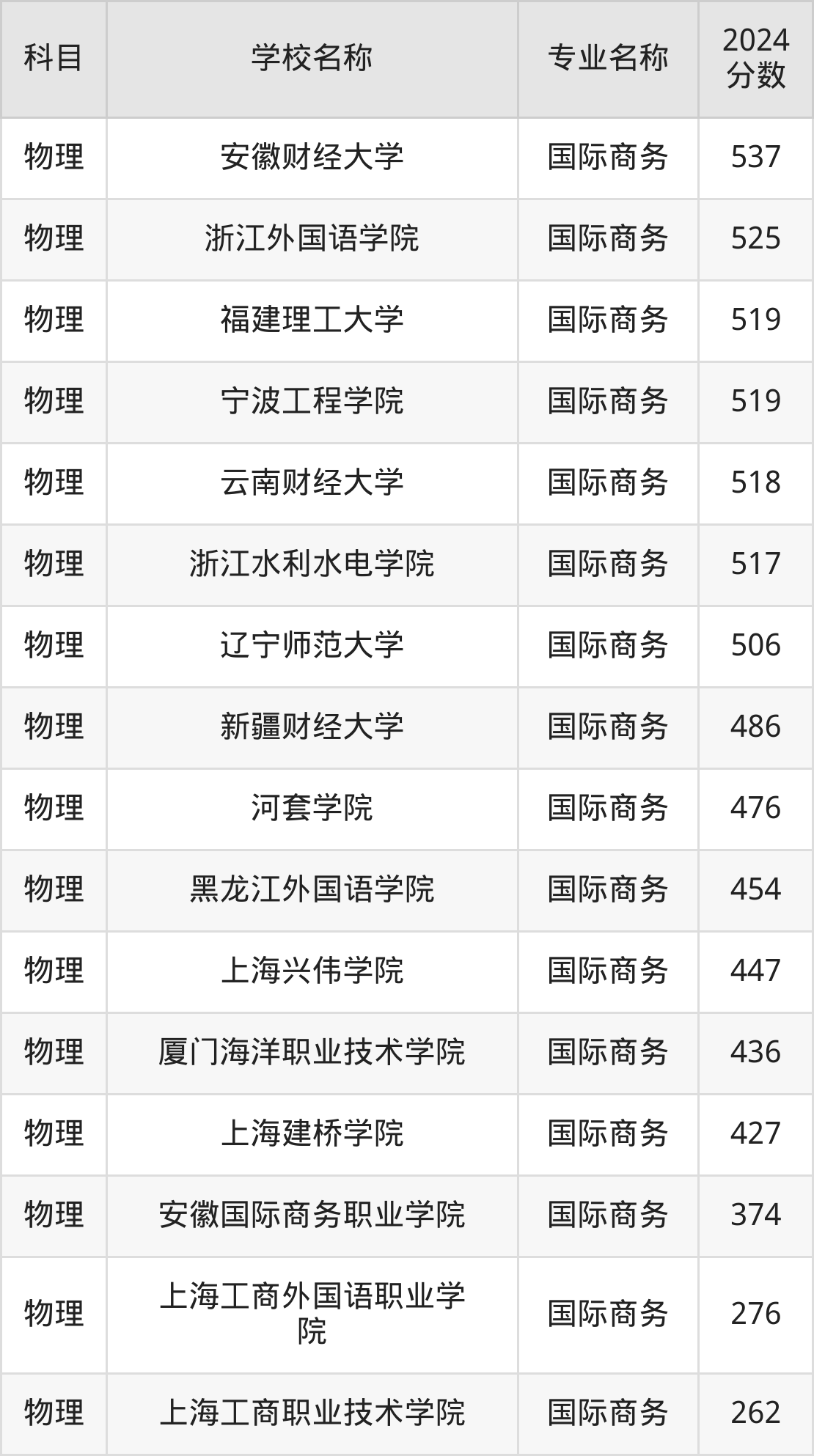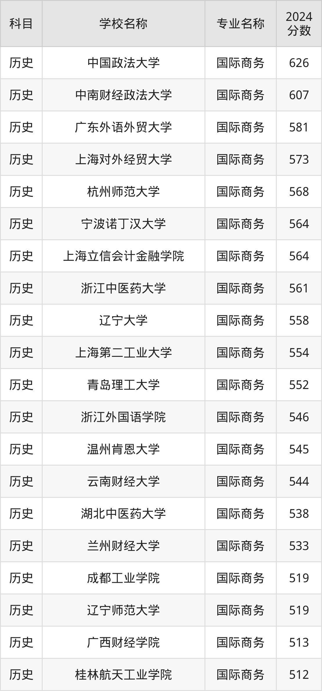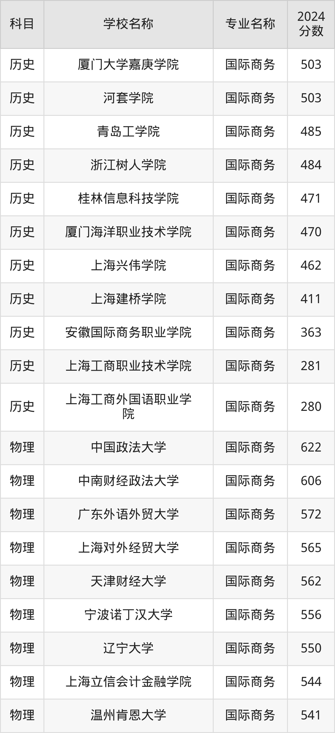 通过上文大家可以知晓,在江西省内招国际商务专业的院校数量较少,所以下文将为2025届高考生继续展示:省外大学的国际商务专业2024年在江西高考的录取情况,包含中国政法大学、中南财经政法大学、广东外语外贸大学、上海对外经贸大学、杭州师范大学。