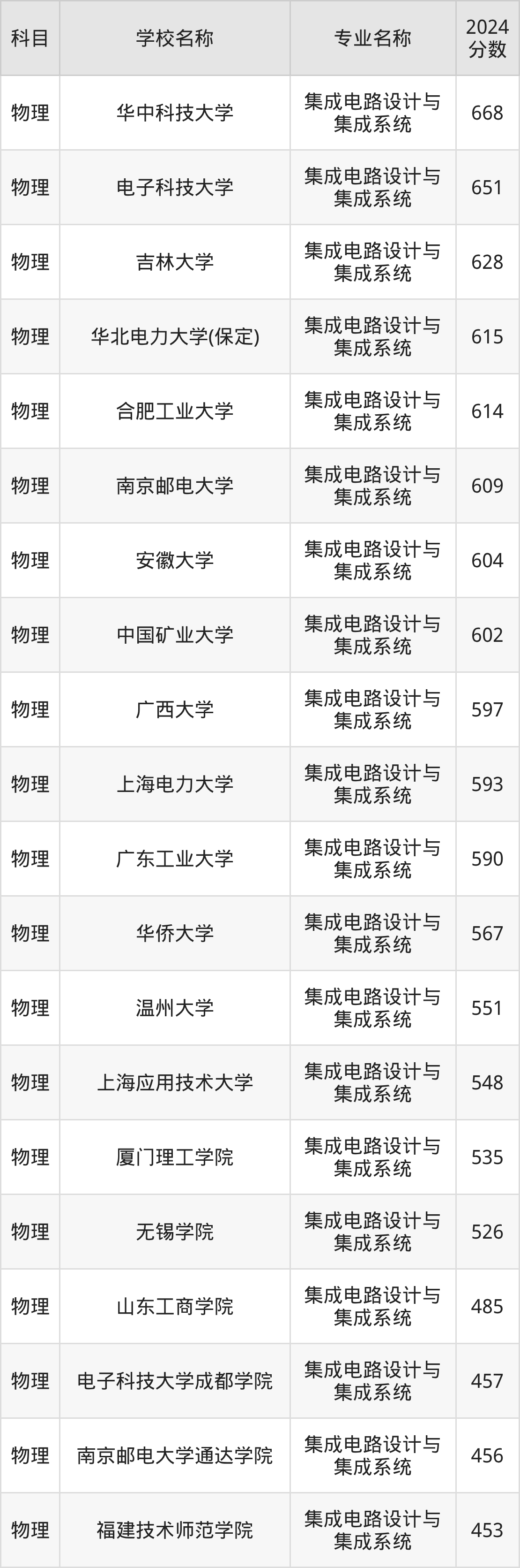 通过上文大家可以知晓,在湖南省内招集成电路设计与集成系统专业的院校数量较少,所以下文将为2026届高考生继续展示:省外大学的集成电路设计与集成系统专业2024年在湖南高考的录取情况,包含华中科技大学、电子科技大学、吉林大学、华北电力大学(保定)、合肥工业大学。