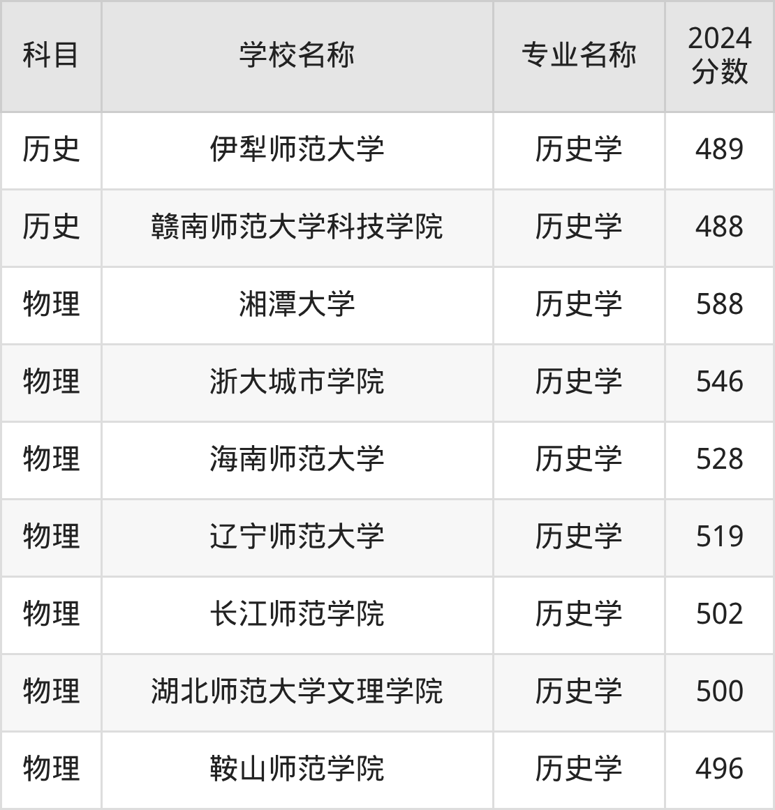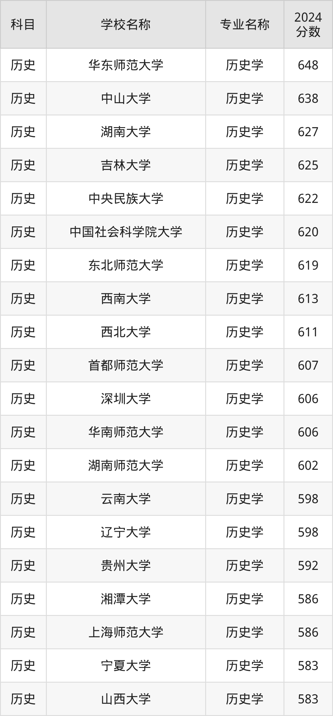通过上文大家可以知晓,在安徽省内招历史学专业的院校数量较少,所以下文将为2026届高考生继续展示:省外大学的历史学专业2024年在安徽高考的录取情况,包含华东师范大学、中山大学、湖南大学、吉林大学、中央民族大学。
