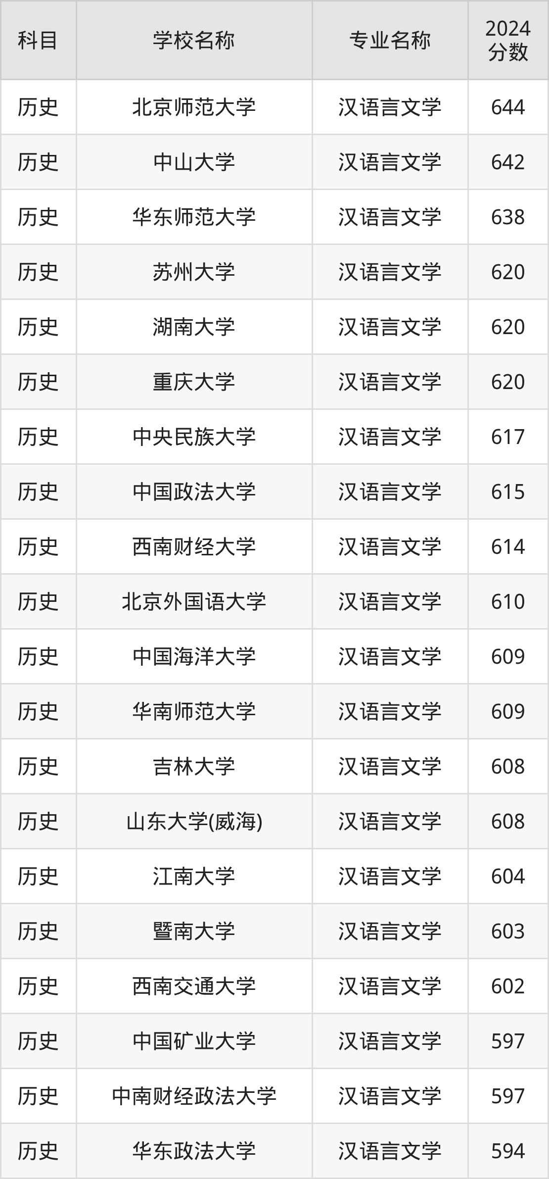 通过上文大家可以知晓,在广西壮族自治区内招汉语言文学专业的院校数量较少,所以下文将为2026届高考生继续展示:壮族自治区外大学的汉语言文学专业2024年在广西高考的录取情况,包含北京师范大学、中山大学、华东师范大学、苏州大学、湖南大学。