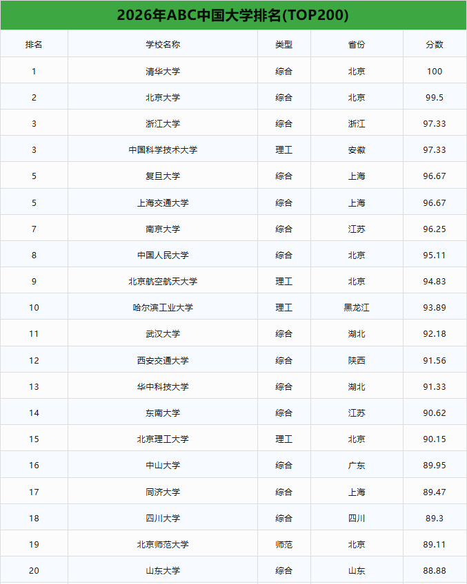 从整体格局来看,头部高校竞争格局保持稳定,学科类型院校分化明显,部分行业特色高校排名表现亮眼。以下为2026年ABC中国大学排名的重点分类盘点。