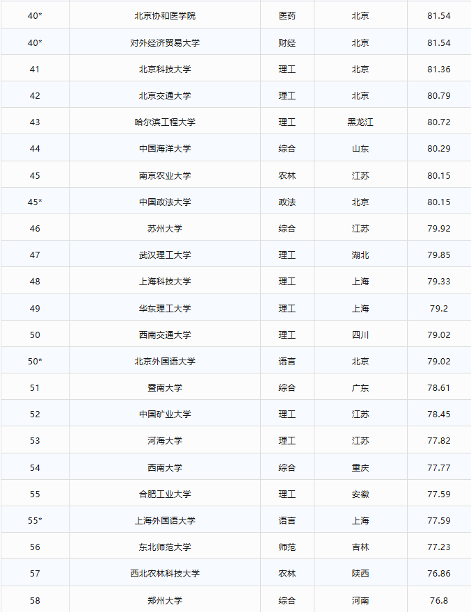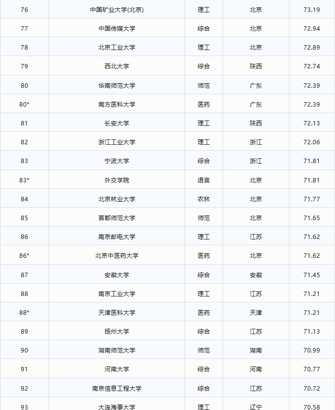 语言类高校方面,北京外国语大学排名全国第50;上海外国语大学第55;外交学院第83;北京语言大学第105;广东外语外贸大学第141。本年度共有13所语言类高校入榜。