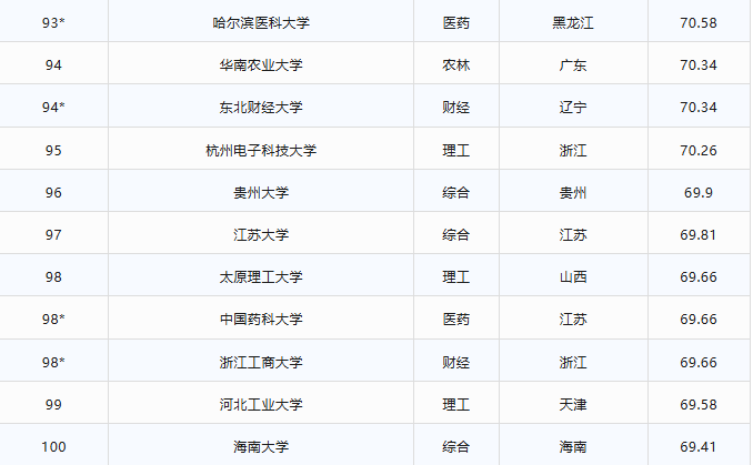财经类高校整体竞争激烈。中央财经大学与上海财经大学并列全国第36位;对外经济贸易大学排名第40;西南财经大学第63;中南财经政法大学第71。本年度共有51所财经类高校进入排名。