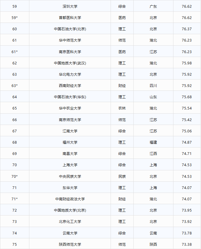 在非“双一流”高校中,深圳大学与首都医科大学并列全国第59位,综合实力突出;南方医科大学排名第80;浙江工业大学第82;南京工业大学第88。这类高校在区域影响力、应用型科研和人才培养方面表现亮眼,受到考生广泛关注。
