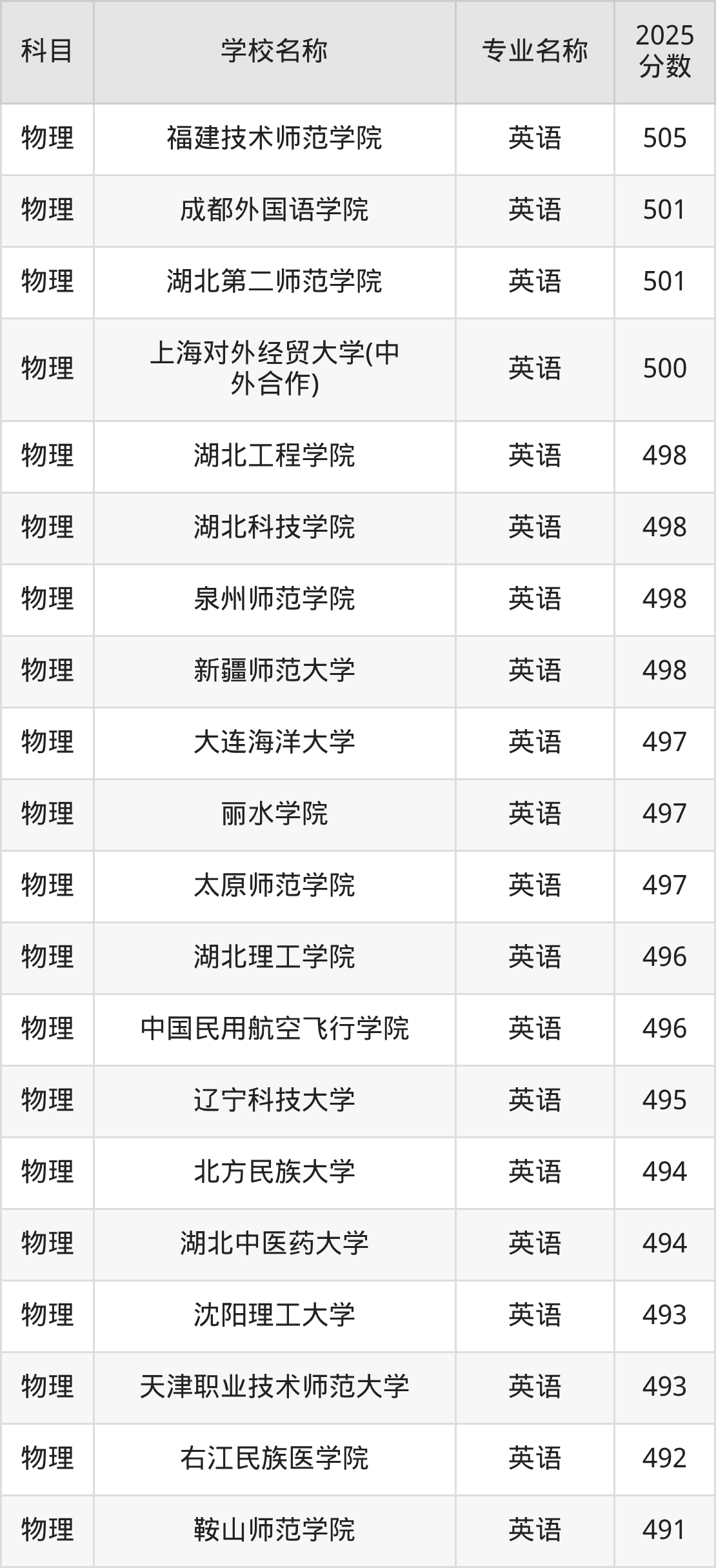 | 遵义医科大学医学与科 技学院 | 英语 | 485 |