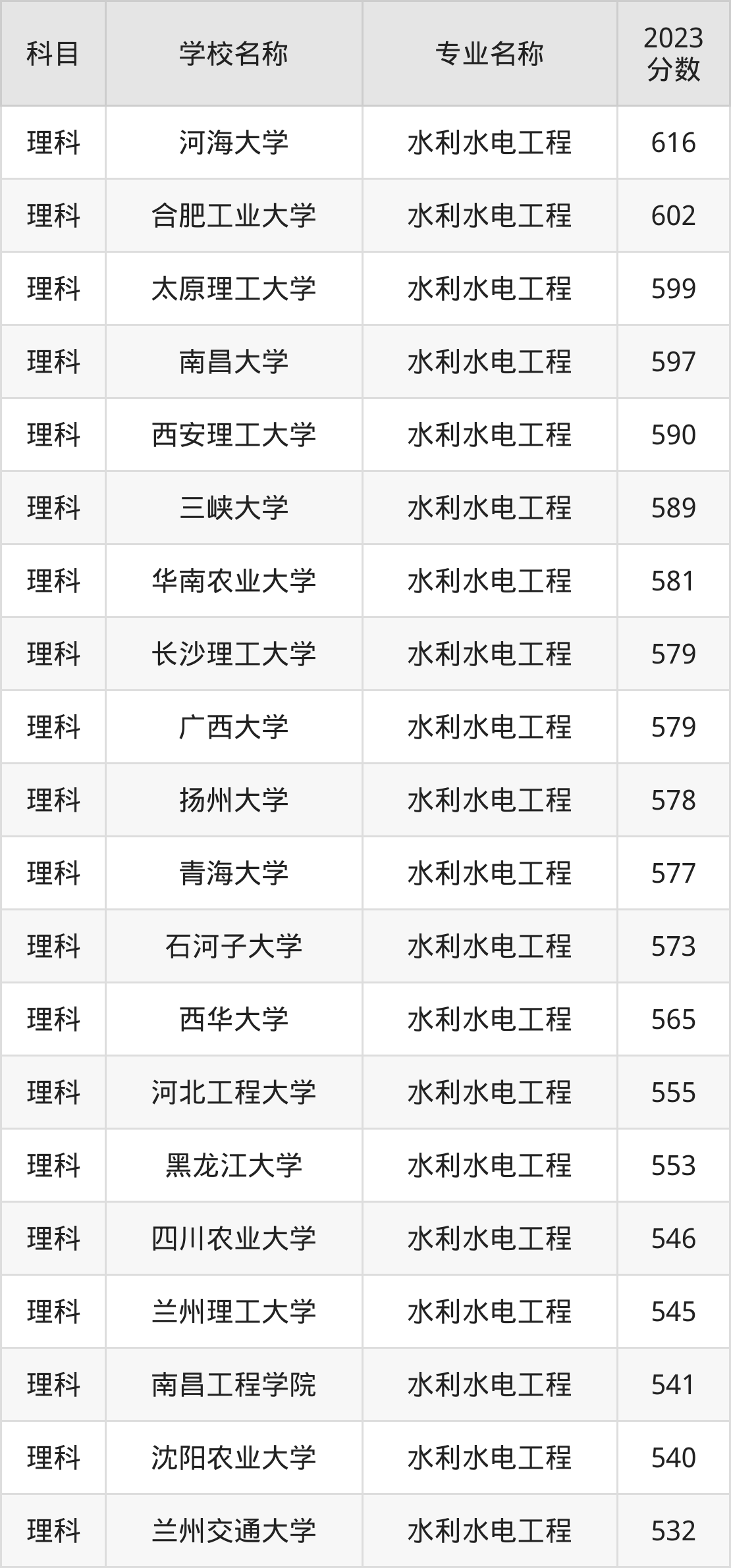 通过上文大家可以知晓,在河南省内招水利水电工程专业的院校数量较少,所以下文将为2025届高考生继续展示:省外大学的水利水电工程专业2023年在河南高考的录取情况,包含河海大学、合肥工业大学、太原理工大学、南昌大学、西安理工大学。