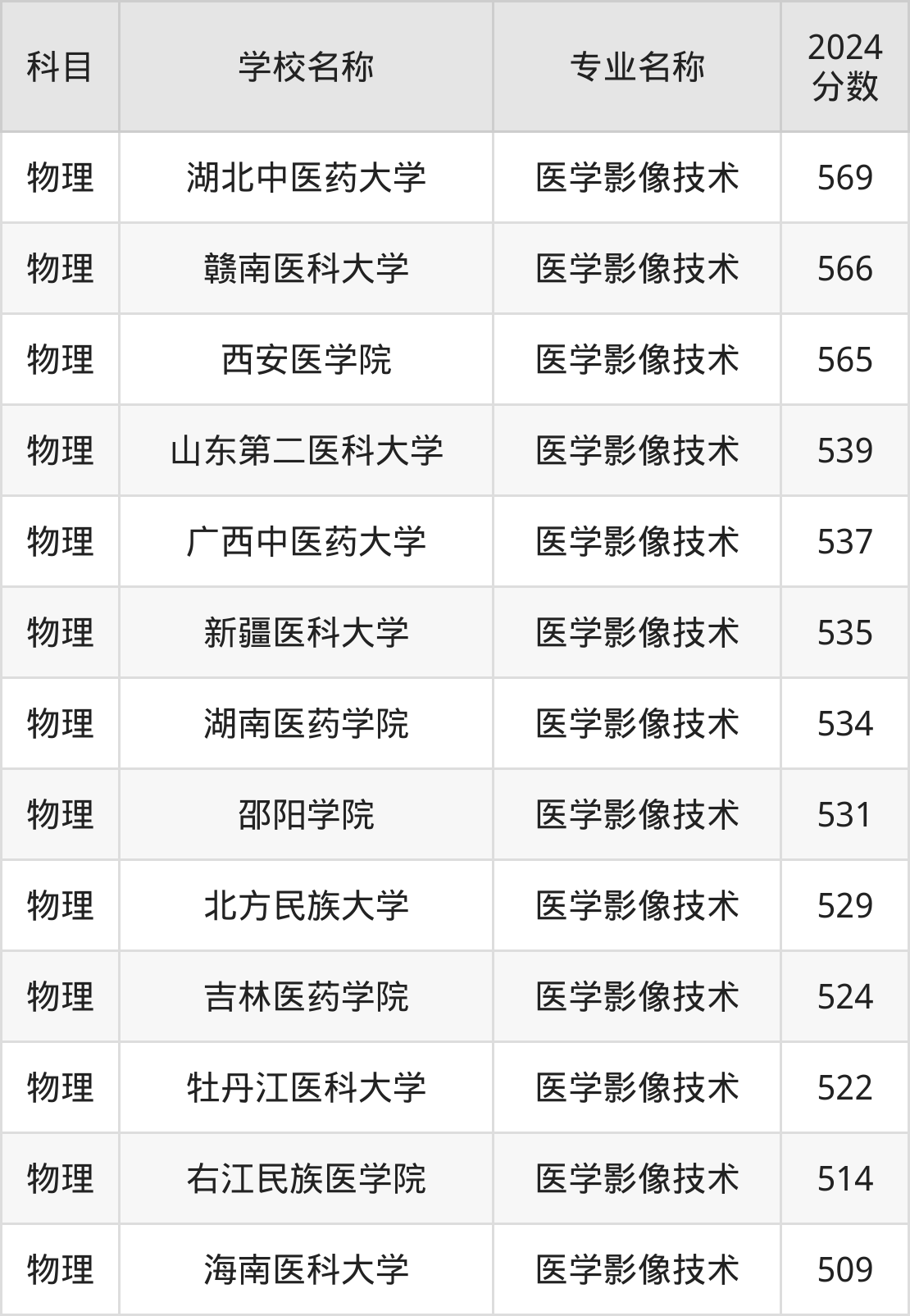 通过上文大家可以知晓,在江苏省内招医学影像技术专业的院校数量较少,所以下文将为2025届高考生继续展示:省外大学的医学影像技术专业2024年在江苏高考的录取情况,包含湖北中医药大学、赣南医科大学、西安医学院、山东第二医科大学、广西中医药大学。