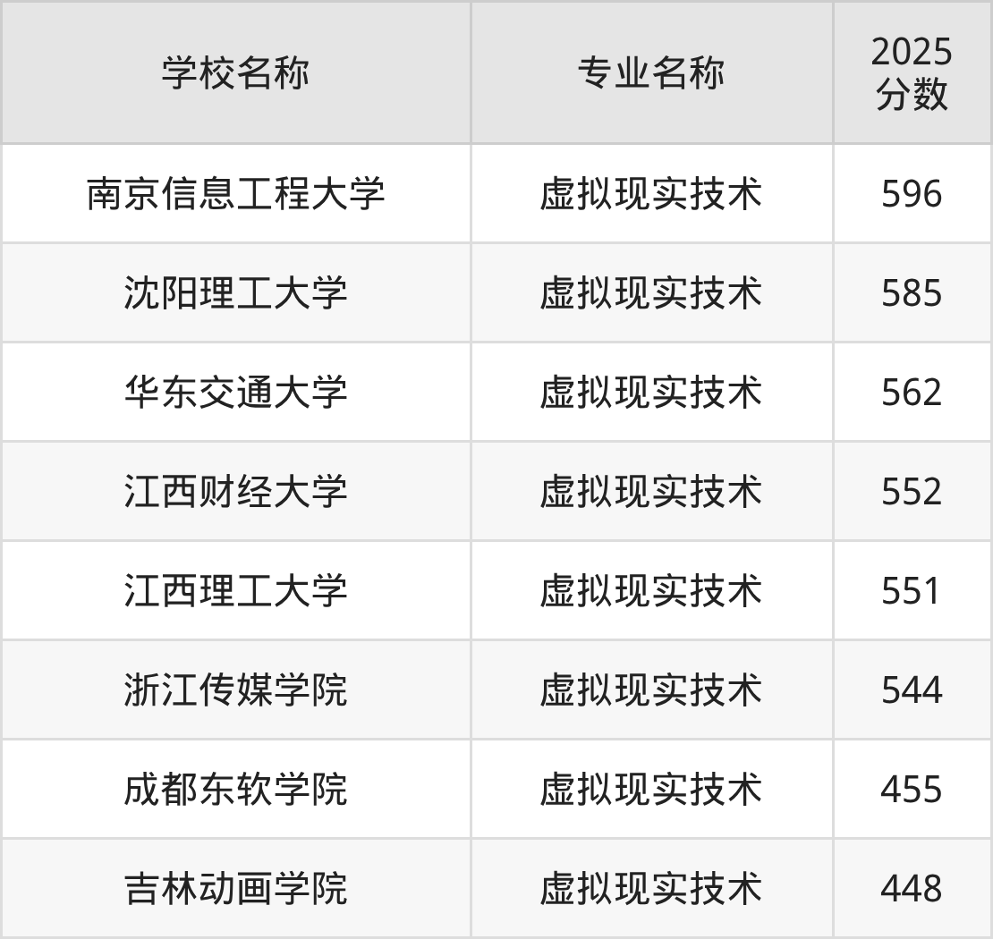 通过上文大家可以知晓,在山东省内招虚拟现实技术专业的院校数量较少,所以下文将为2026届高考生继续展示:省外大学的虚拟现实技术专业2025年在山东高考的录取情况,包含南京信息工程大学、沈阳理工大学、华东交通大学、江西财经大学、江西理工大学。