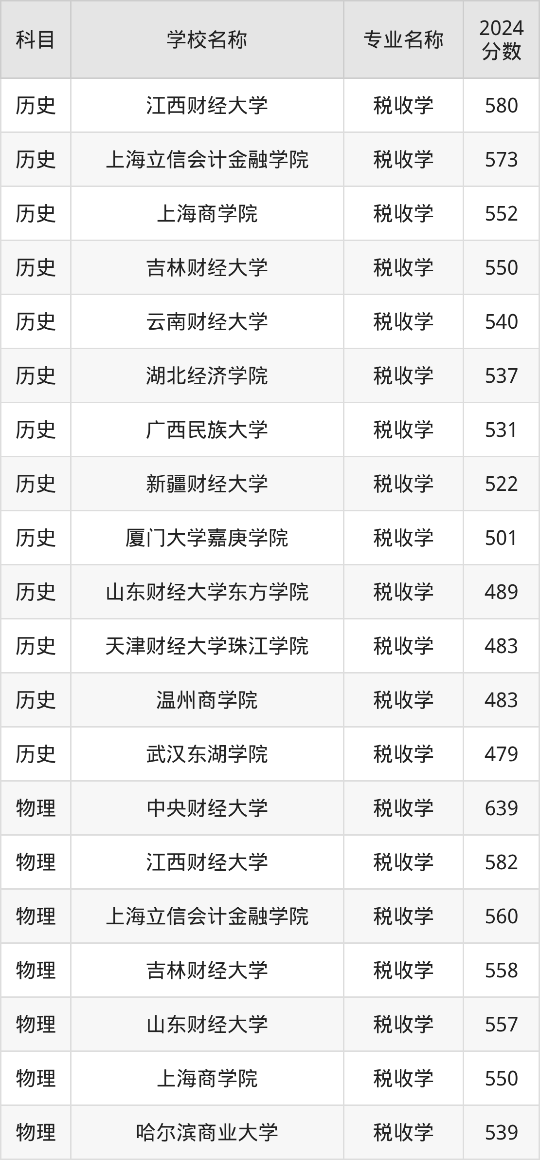 通过上文大家可以知晓,在江苏省内招税收学专业的院校数量较少,所以下文将为2026届高考生继续展示:省外大学的税收学专业2024年在江苏高考的录取情况,包含江西财经大学、上海立信会计金融学院、上海商学院、吉林财经大学、云南财经大学。
