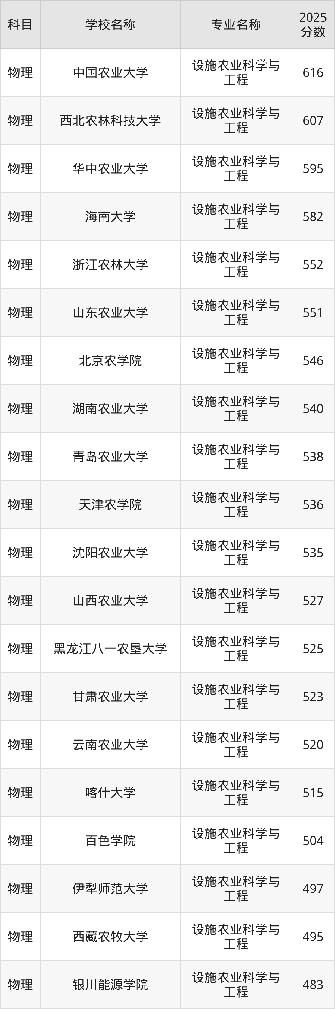 通过上文大家可以知晓,在河北省内招设施农业科学与工程专业的院校数量较少,所以下文将为2026届高考生继续展示:省外大学的设施农业科学与工程专业2025年在河北高考的录取情况,包含中国农业大学、西北农林科技大学、华中农业大学、海南大学、浙江农林大学。