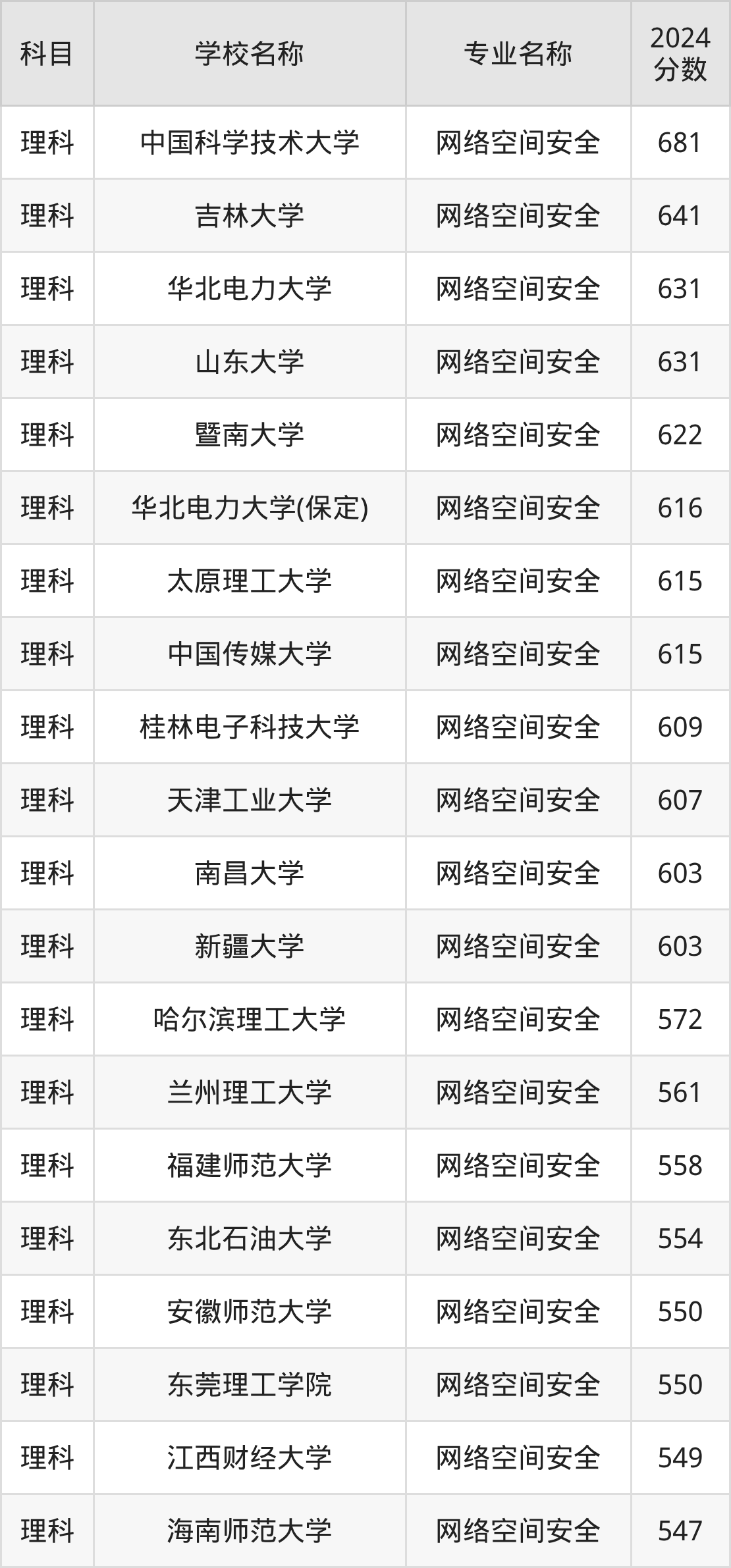 通过上文大家可以知晓,在四川省内招网络空间安全专业的院校数量较少,所以下文将为2026届高考生继续展示:省外大学的网络空间安全专业2024年在四川高考的录取情况,包含中国科学技术大学、吉林大学、华北电力大学、山东大学、暨南大学。