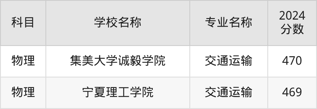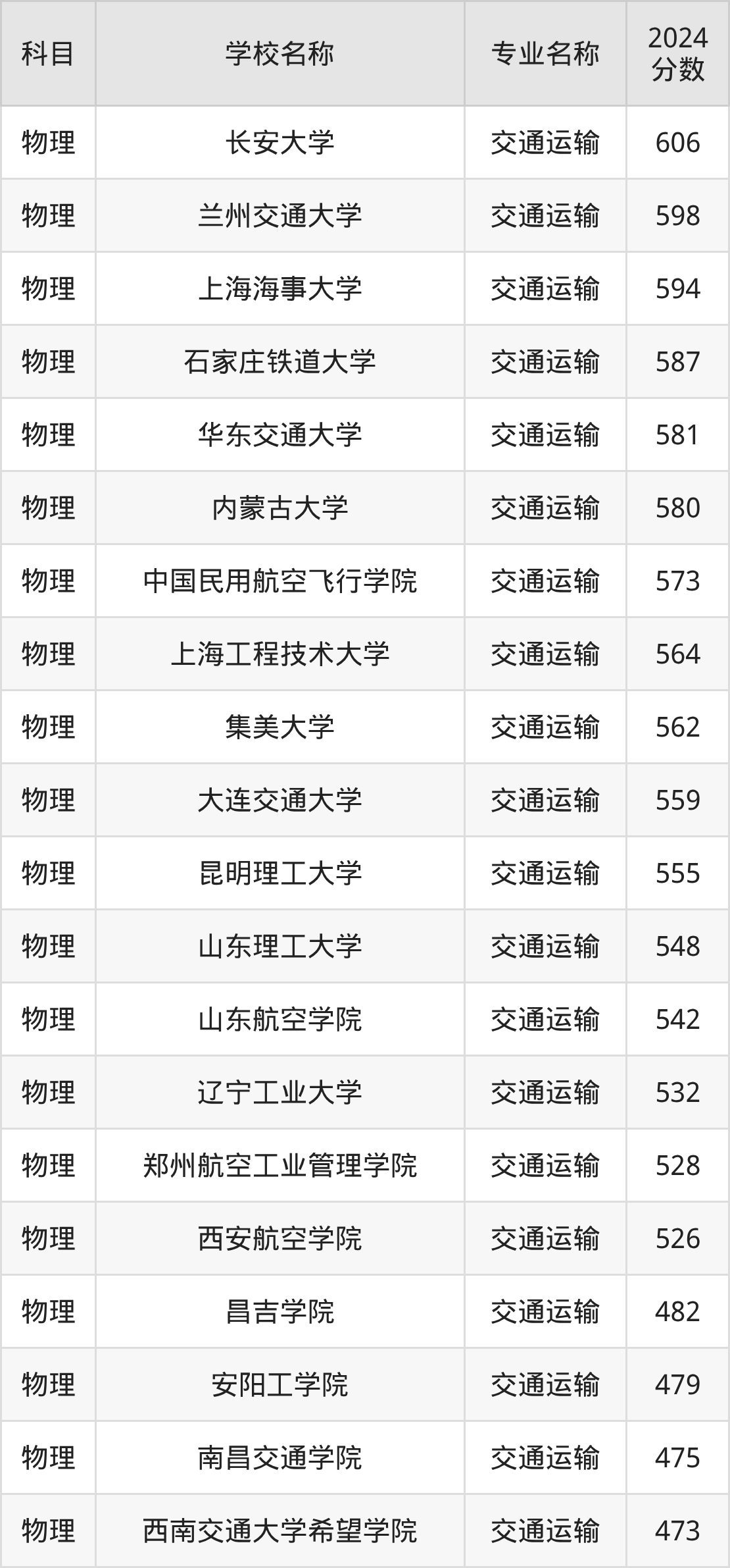 通过上文大家可以知晓,在江苏省内招交通运输专业的院校数量较少,所以下文将为2026届高考生继续展示:省外大学的交通运输专业2024年在江苏高考的录取情况,包含长安大学、兰州交通大学、上海海事大学、石家庄铁道大学、华东交通大学。