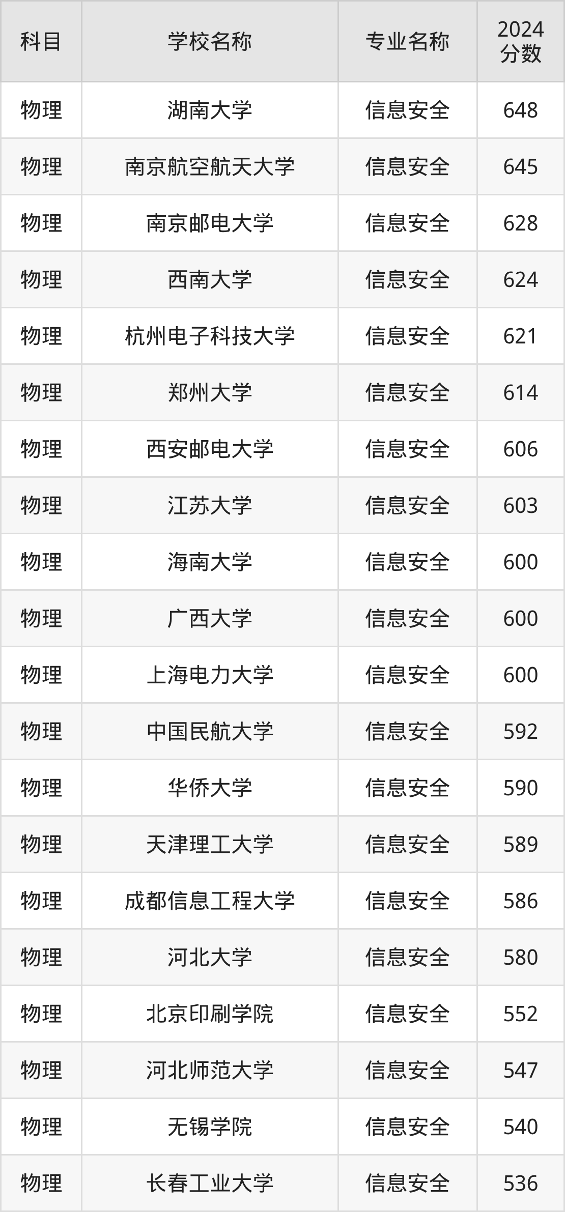 通过上文大家可以知晓,在安徽省内招信息安全专业的院校数量较少,所以下文将为2026届高考生继续展示:省外大学的信息安全专业2024年在安徽高考的录取情况,包含湖南大学、南京航空航天大学、南京邮电大学、西南大学、杭州电子科技大学。