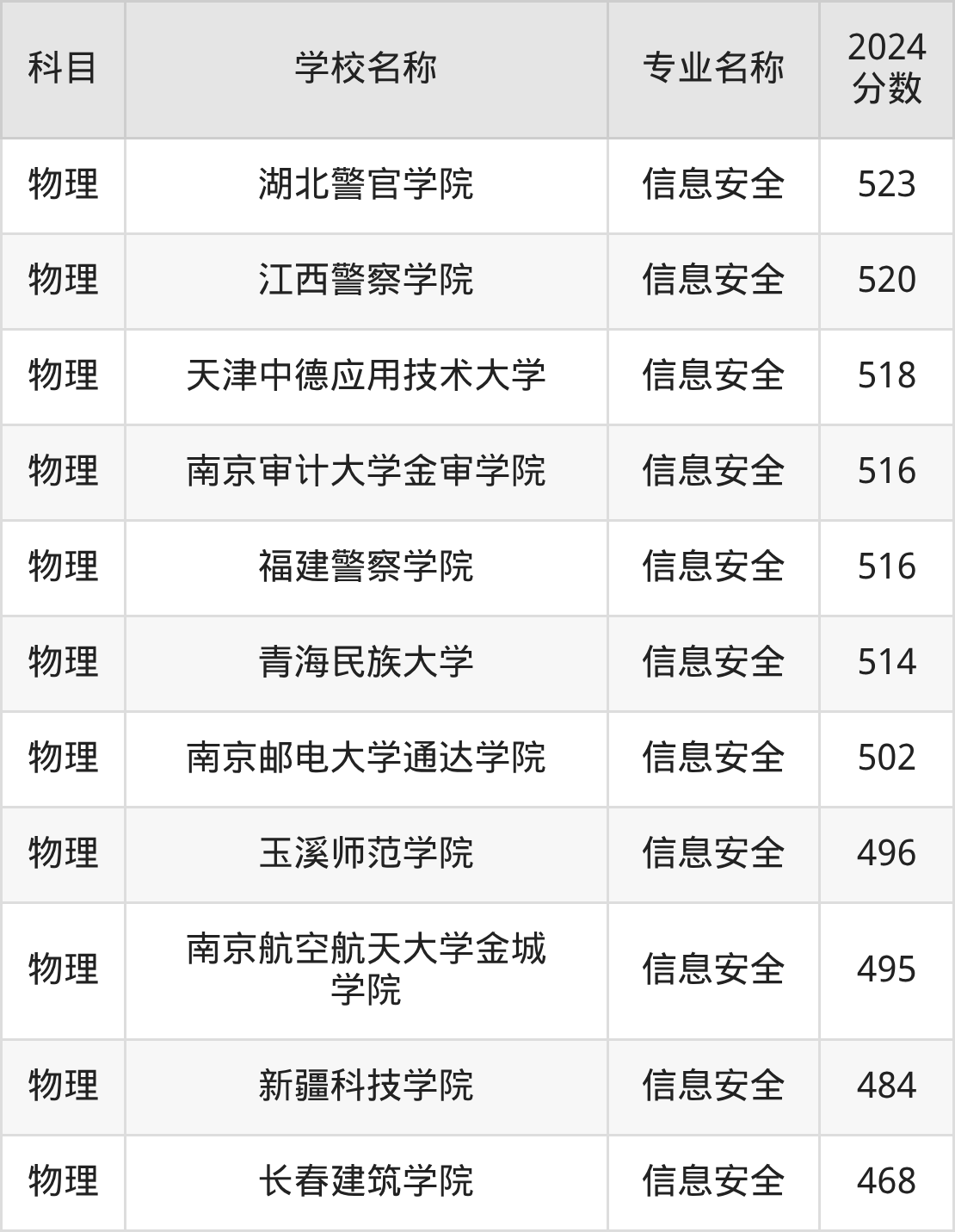 安徽高考物理组:信息安全专业的最低分是465分~637分