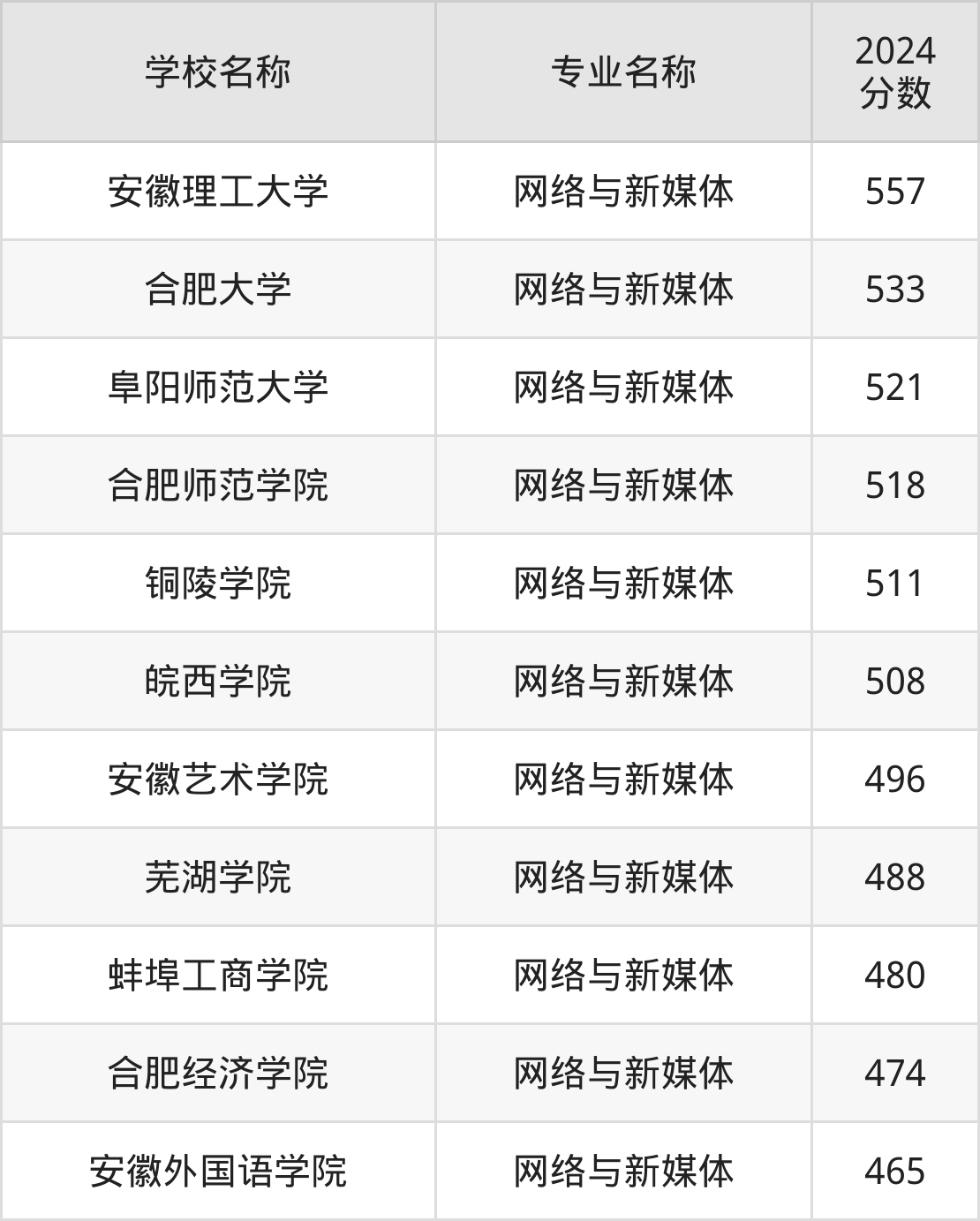 下文将为大家展示安徽省大学网络与新媒体专业2024年在安徽高考的最低录取分数线!
