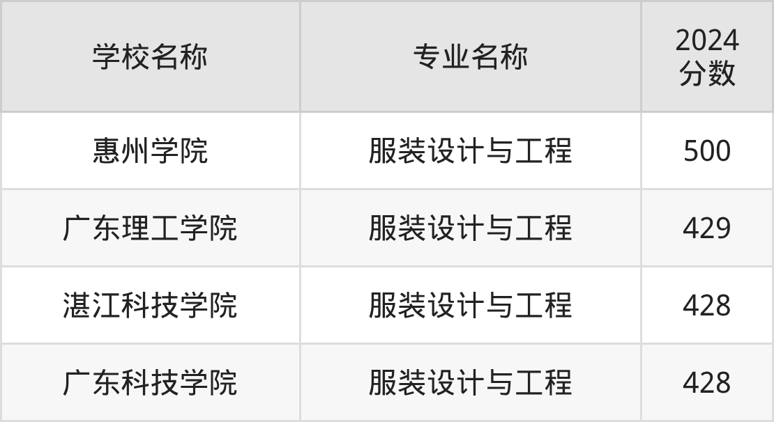 在直接以“服装设计与工程”的名称招生的广东省大学中,惠州学院的分数线最高、排名第一名,在物理组的最低分是501分,全省排名前146663位的高考生才有较大机会被录取。