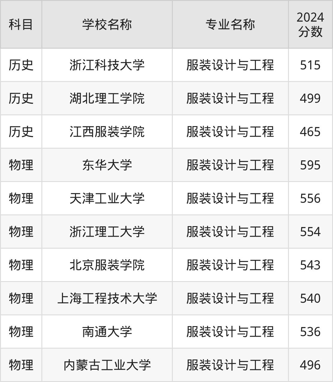 通过上文大家可以知晓,在广东省内招服装设计与工程专业的院校数量较少,所以下文将为2026届高考生继续展示:省外大学的服装设计与工程专业2024年在广东高考的录取情况,包含浙江科技大学、湖北理工学院、江西服装学院、东华大学、天津工业大学。