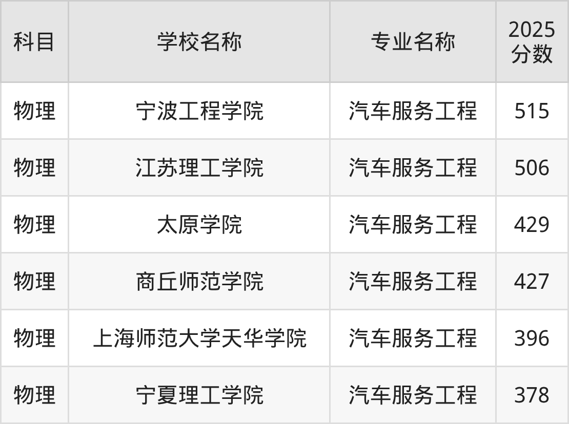 在直接以“汽车服务工程”的名称招生的内蒙古自治区大学中,鄂尔多斯应用技术学院的分数线最高、排名第一名,在物理组的最低分是412分,全自治区排名前57566位的高考生才有较大机会被录取。