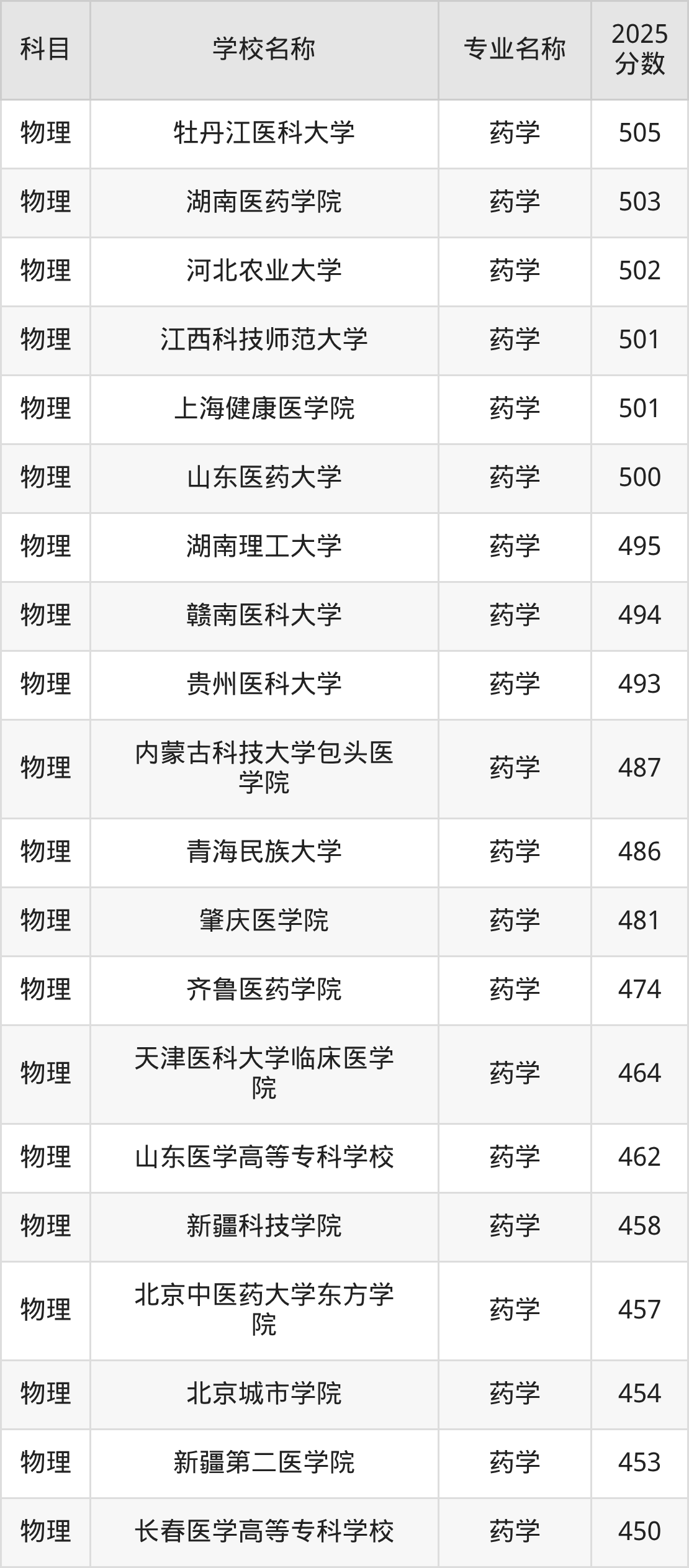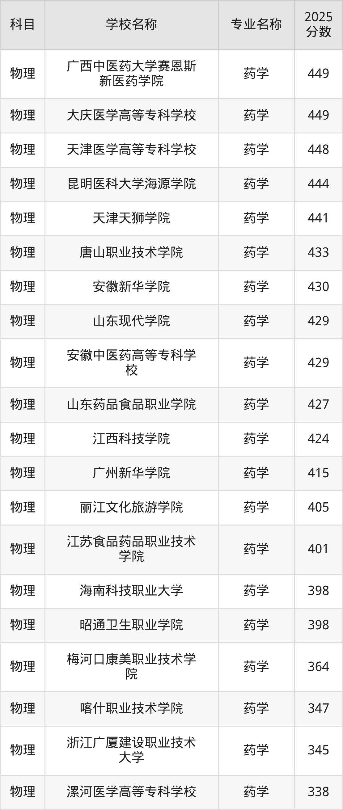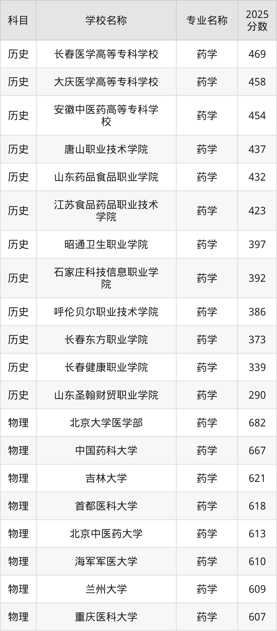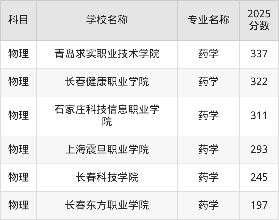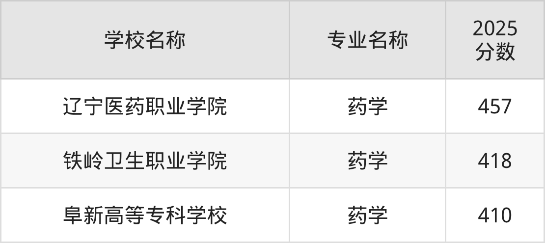 通过上文大家可以知晓,在辽宁省内招药学专业的院校数量较少,所以下文将为2026届高考生继续展示:省外大学的药学专业2025年在辽宁高考的录取情况,包含长春医学高等专科学校、大庆医学高等专科学校、安徽中医药高等专科学校、唐山职业技术学院、山东药品食品职业学院。