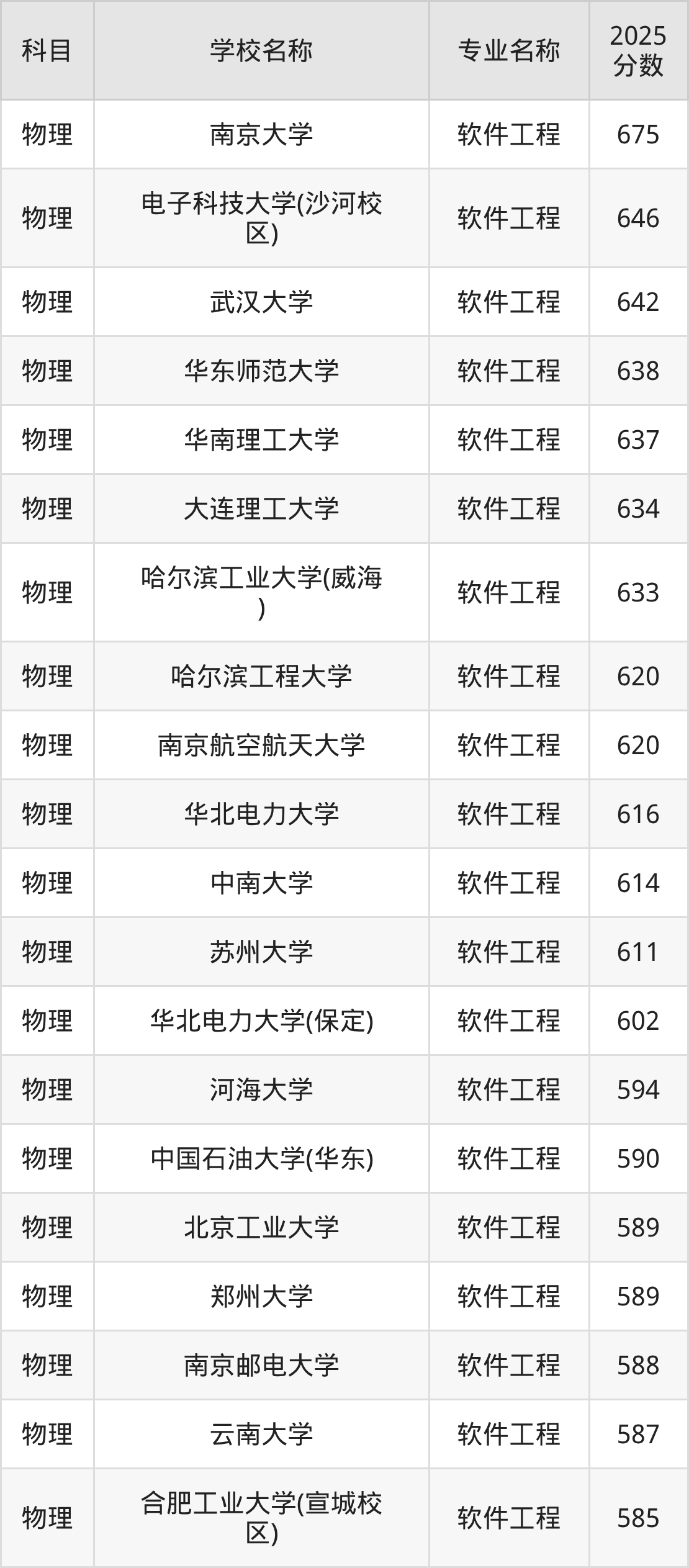 通过上文大家可以知晓,在吉林省内招软件工程专业的院校数量较少,所以下文将为2026届高考生继续展示:省外大学的软件工程专业2025年在吉林高考的录取情况,包含南京大学、电子科技大学(沙河校区)、武汉大学、华东师范大学、华南理工大学。
