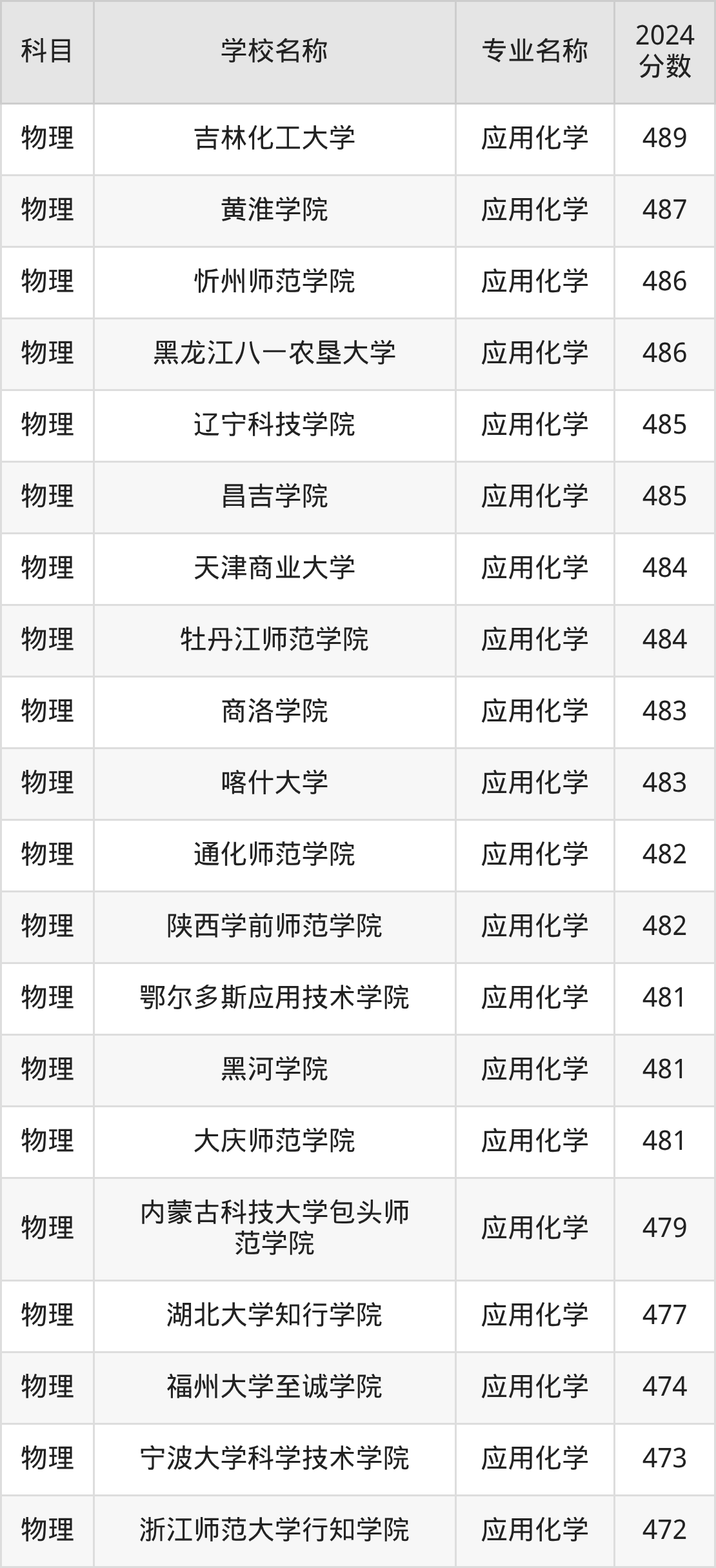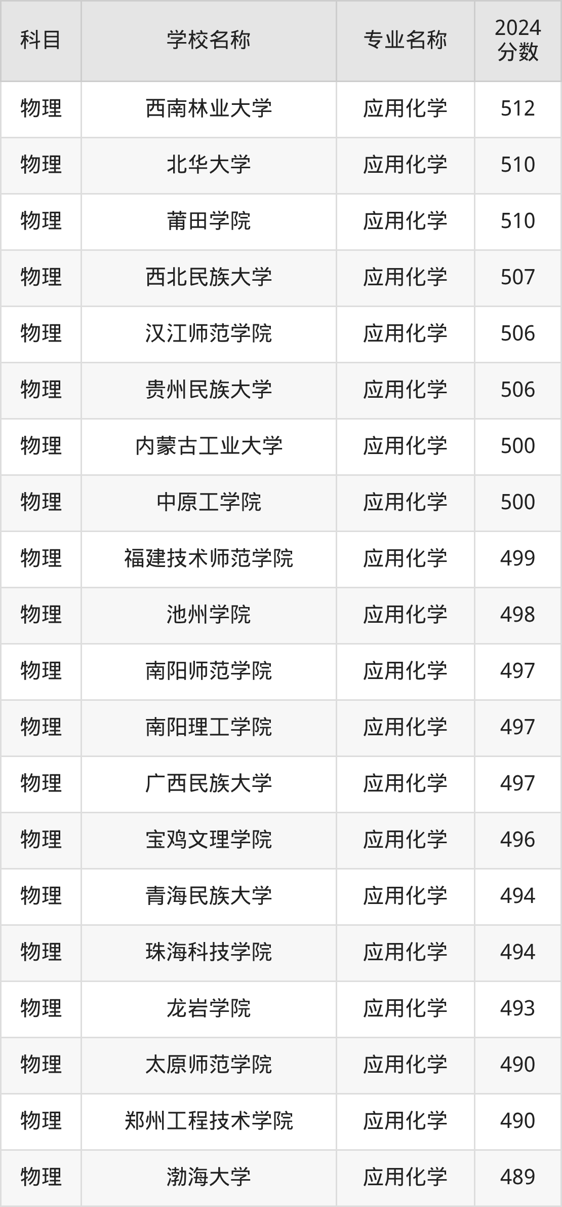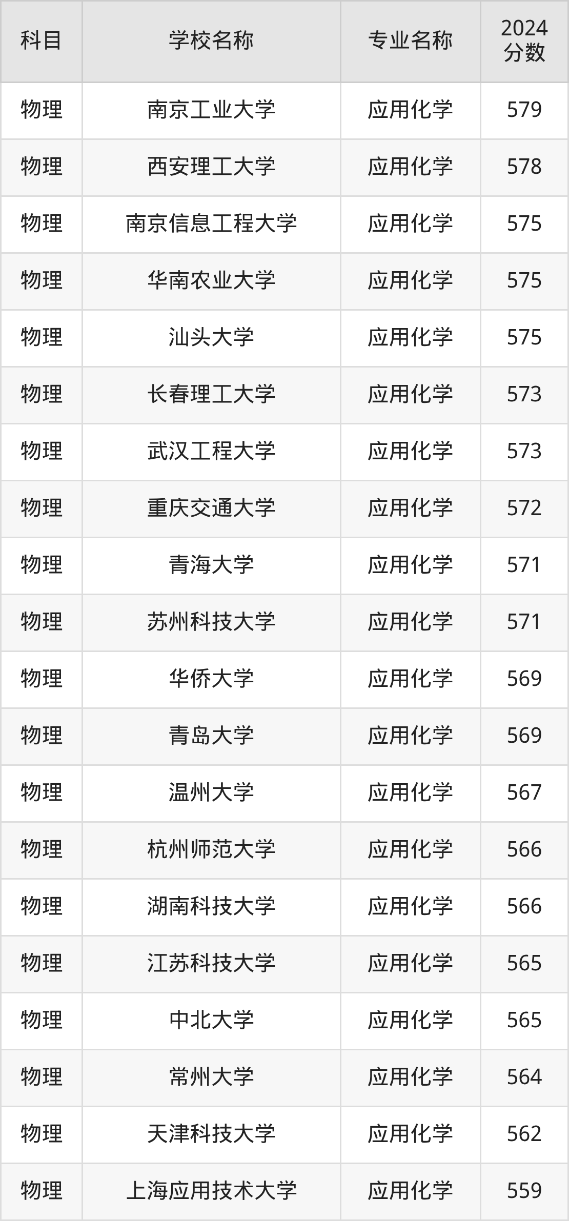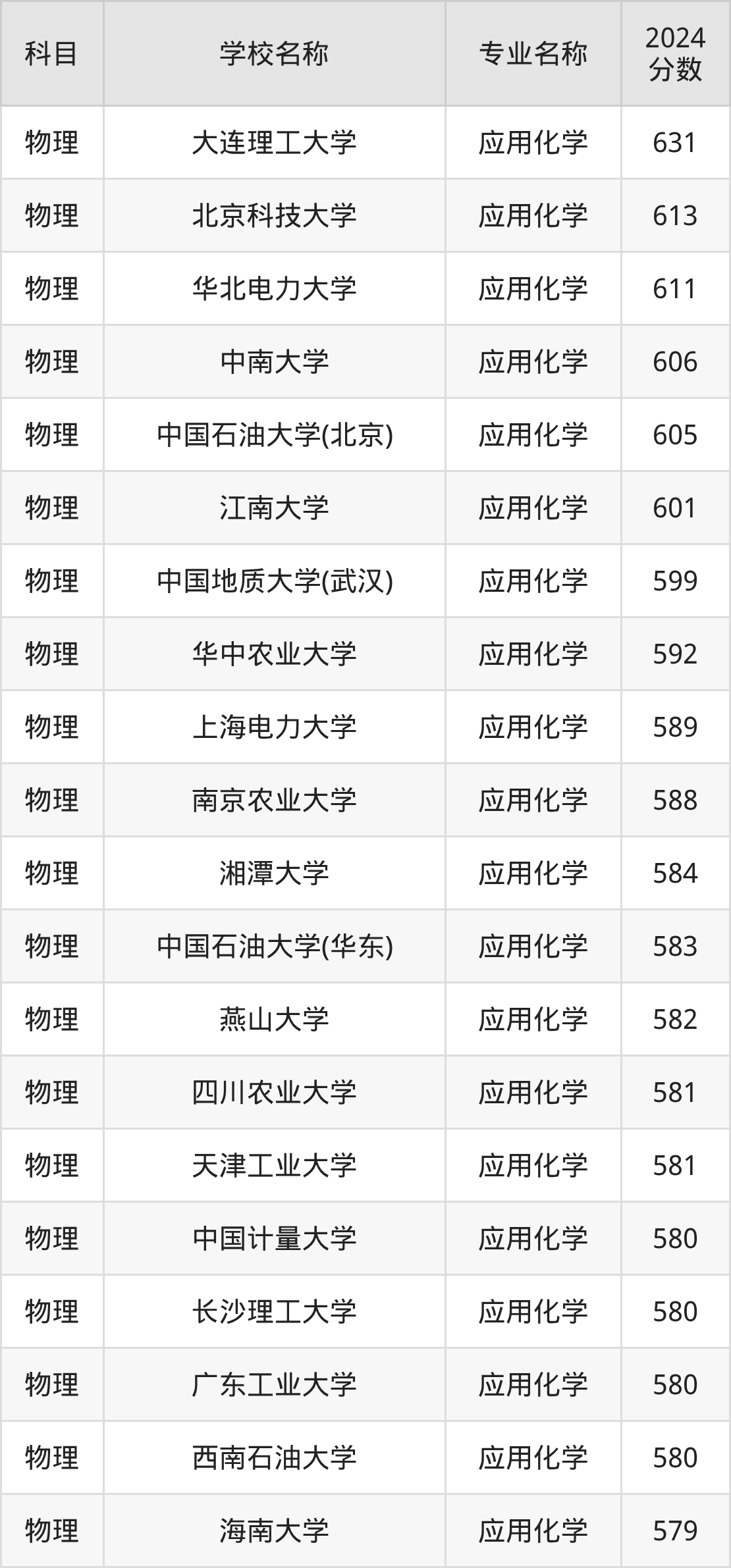 在直接以“应用化学”的名称招生的江西省大学中,南昌大学的分数线最高、排名第一名,在物理组的最低分是582分,全省排名前18974位的高考生才有较大机会被录取。