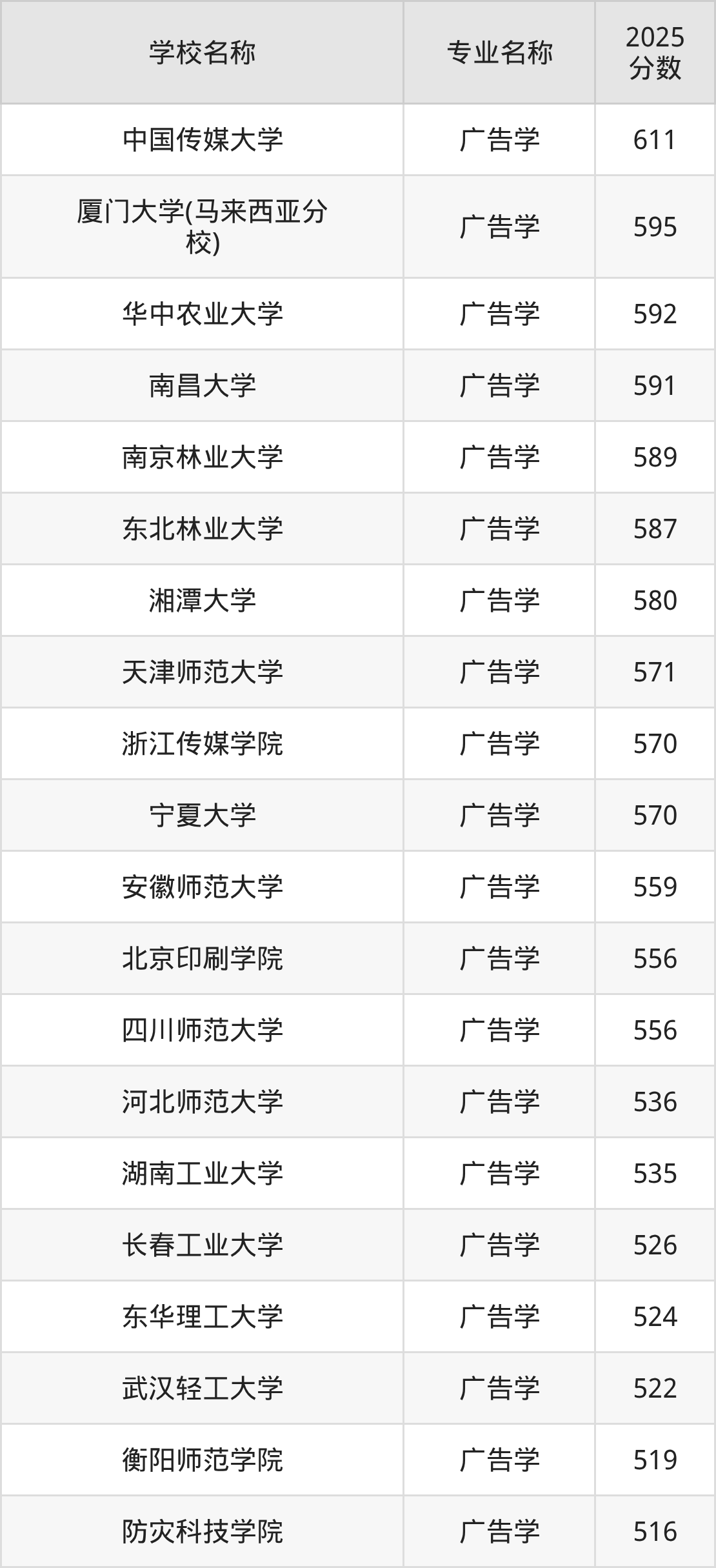 通过上文大家可以知晓,在山东省内招广告学专业的院校数量较少,所以下文将为2026届高考生继续展示:省外大学的广告学专业2025年在山东高考的录取情况,包含中国传媒大学、厦门大学(马来西亚分校)、华中农业大学、南昌大学、南京林业大学。