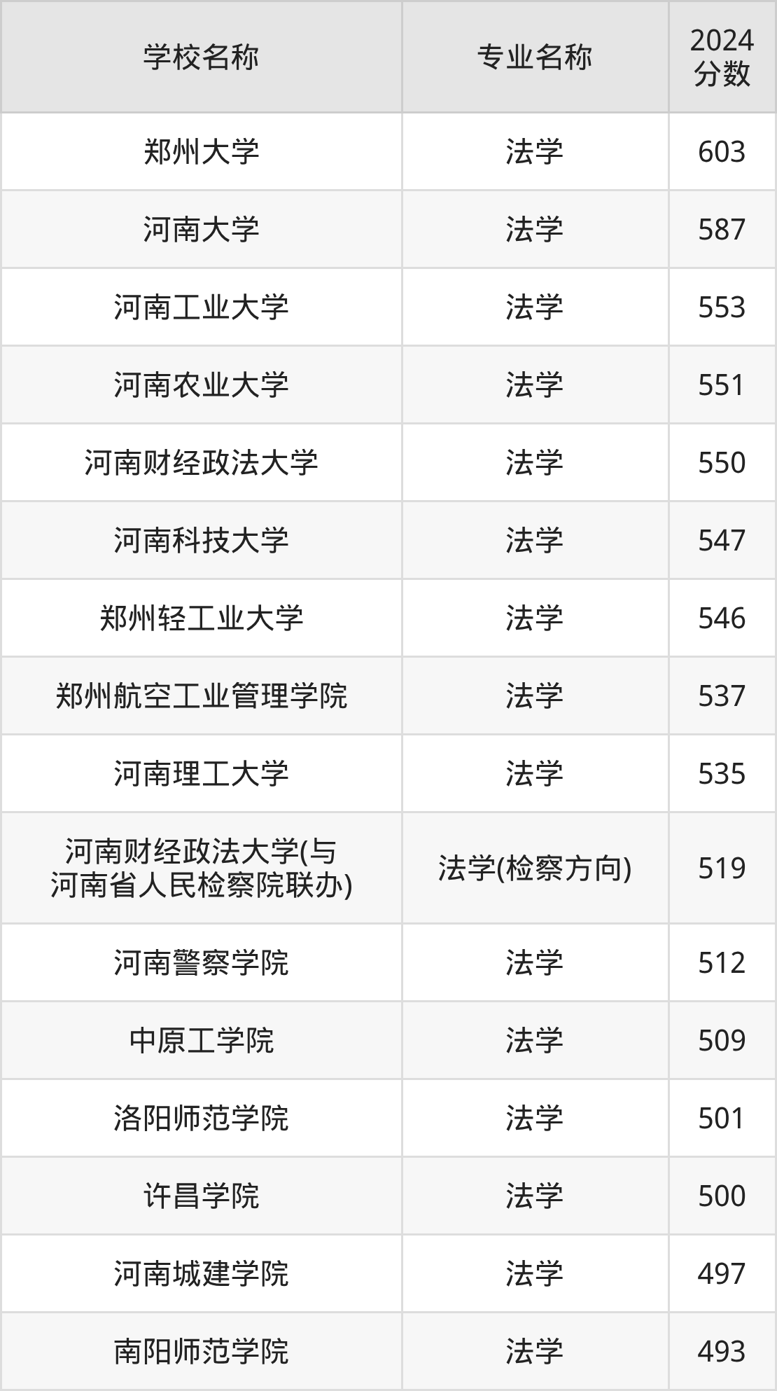 在直接以“法学”的名称招生的河南省大学中,郑州大学的分数线最高、排名第一名,在文科的最低分是596分,全省排名前2393位的高考生才有较大机会被录取。