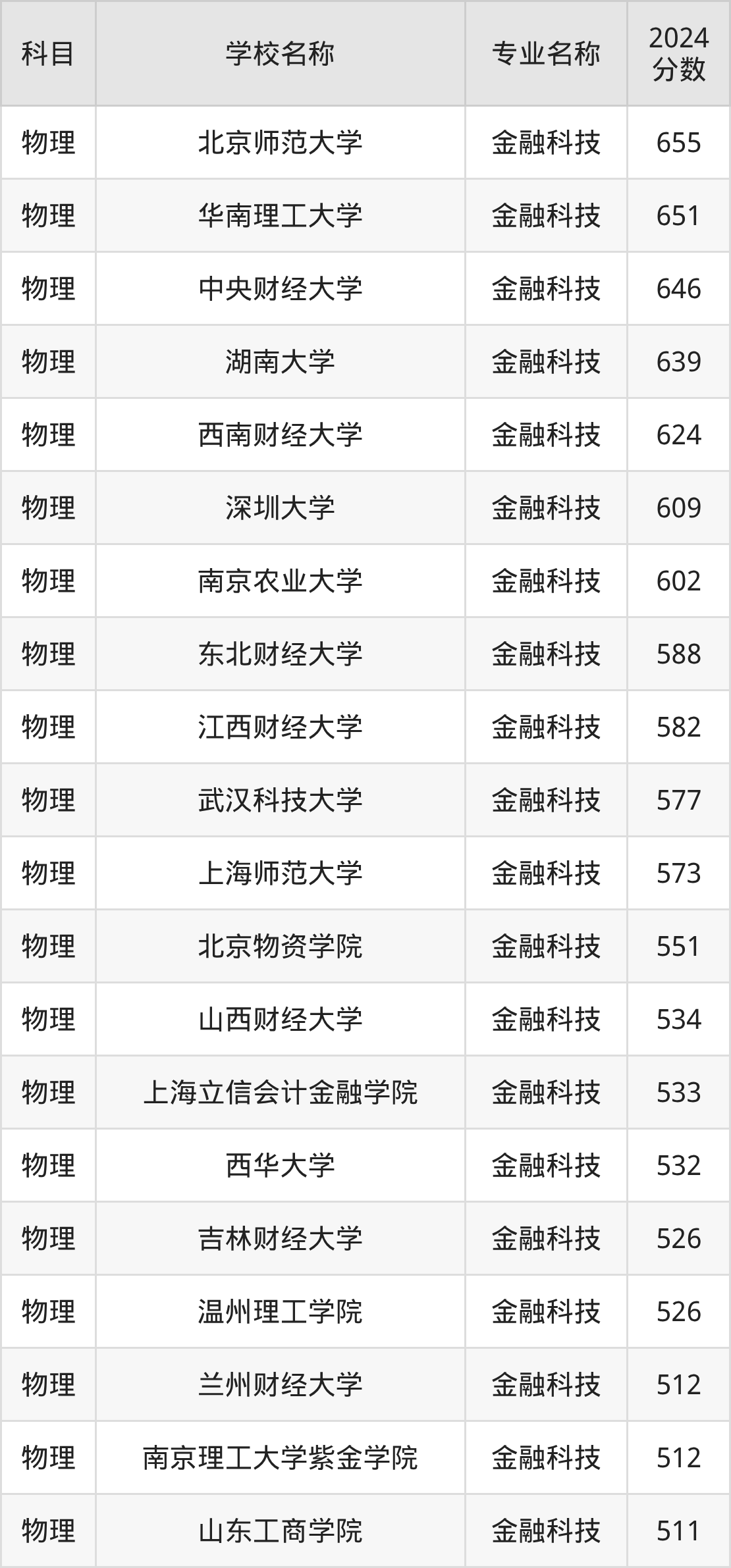 在直接以“金融科技”的名称招生的安徽省大学中,淮北师范大学的分数线最高、排名第一名,在物理组的最低分是515分,全省排名前106051位的高考生才有较大机会被录取。