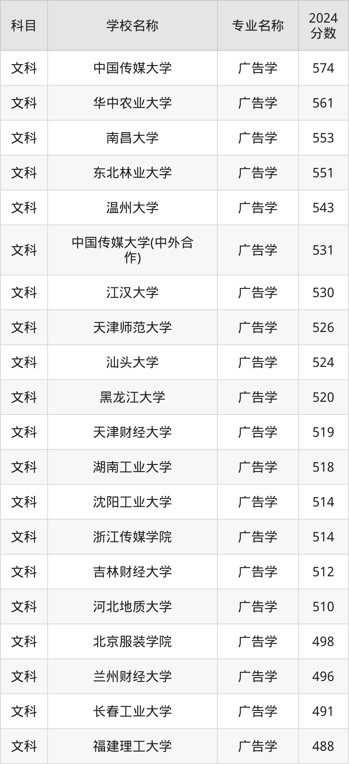 通过上文大家可以知晓,在山西省内招广告学专业的院校数量较少,所以下文将为2025届高考生继续展示:省外大学的广告学专业2024年在山西高考的录取情况,包含中国传媒大学、华中农业大学、南昌大学、东北林业大学、温州大学。