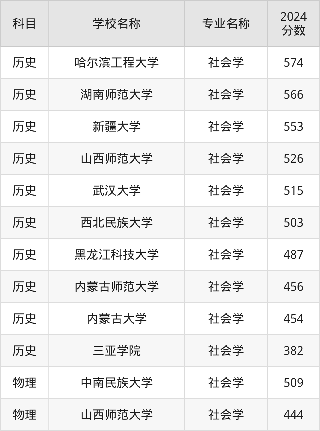 通过上文大家可以知晓,在吉林省内招社会学专业的院校数量较少,所以下文将为2025届高考生继续展示:省外大学的社会学专业2024年在吉林高考的录取情况,包含哈尔滨工程大学、湖南师范大学、新疆大学、山西师范大学、武汉大学。