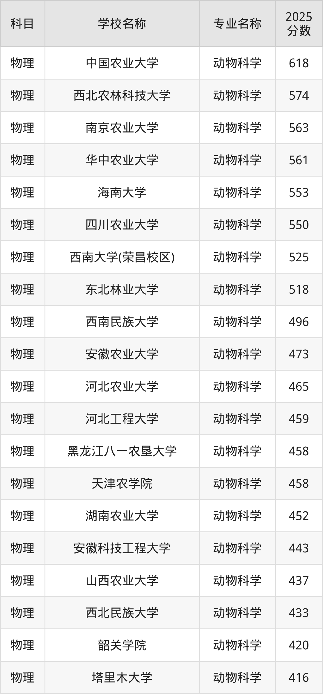 通过上文大家可以知晓,在吉林省内招动物科学专业的院校数量较少,所以下文将为2026届高考生继续展示:省外大学的动物科学专业2025年在吉林高考的录取情况,包含中国农业大学、西北农林科技大学、南京农业大学、华中农业大学、海南大学。