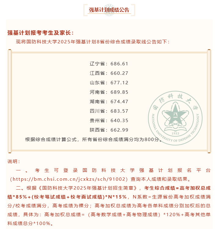 2025年国防科技大学公布的强基计划综合成绩录取分数线如下:辽宁省686.61分、江西省660.27分、山东省677.12分、河南省689.85分、湖南省674.47分、四川省683.57分、贵州省640.35分、陕西省662.99分。