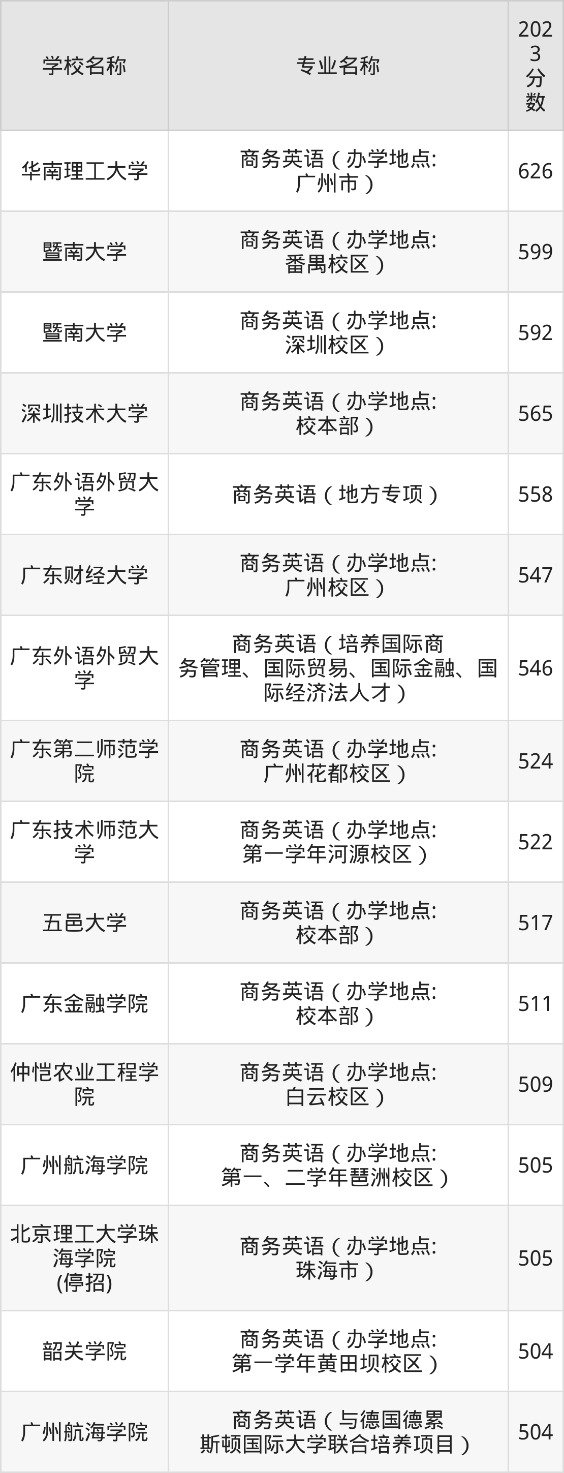 | 华南理工大学 | 商务英语(办学 地点:广州市) | 604 |