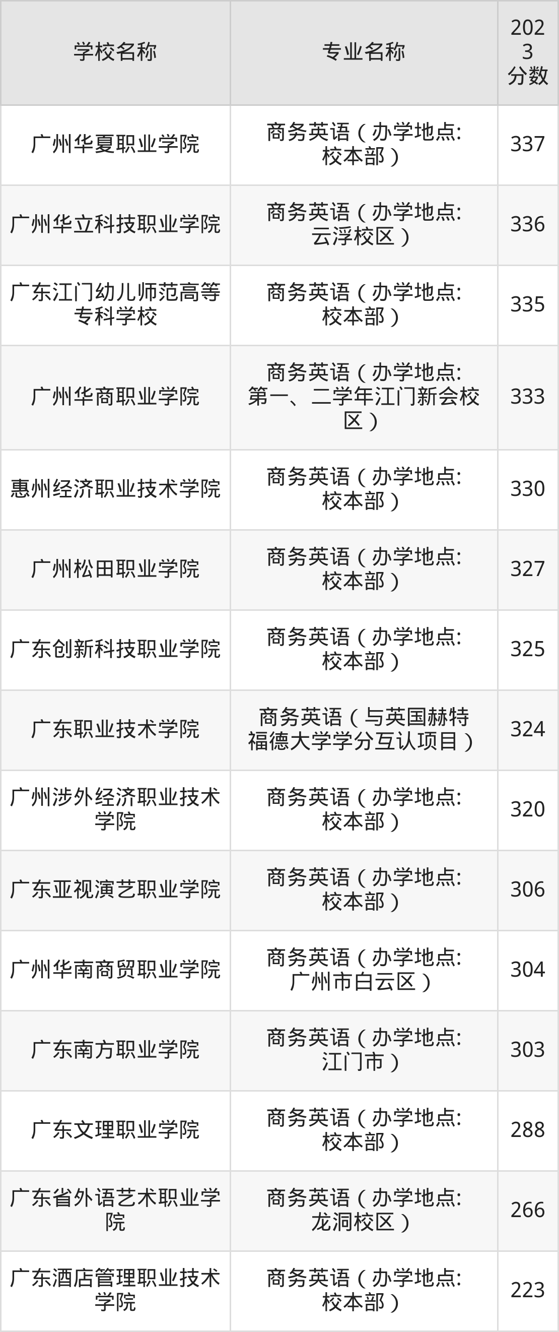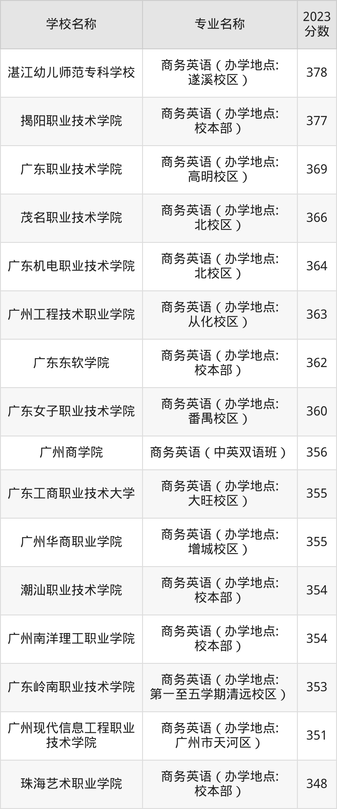 | 广东新安职业技术学院 | 商务英语(办学 地点:校本部) | 379 |