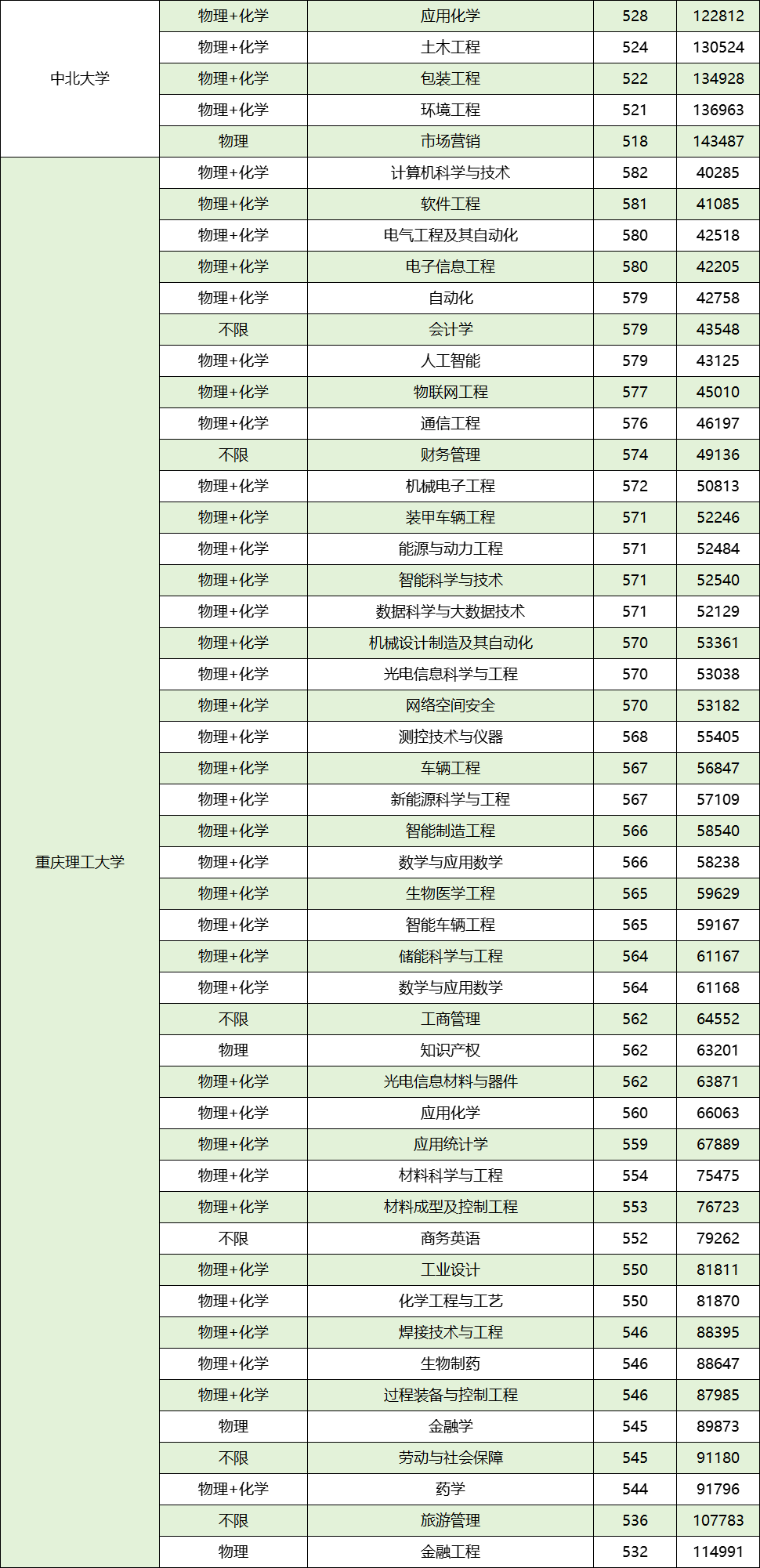 热门工科 570–582分(位次4–5万),如计算机582分;