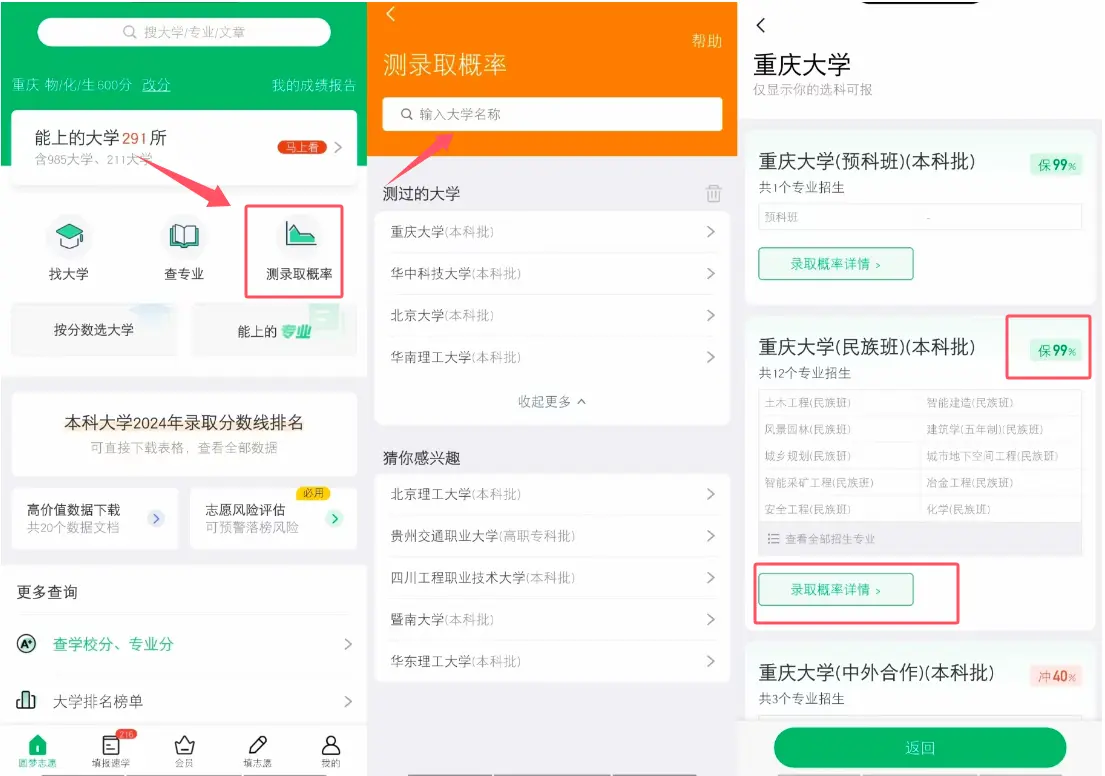 若想冲一冲211高校,系统还会显示如新疆大学、延边大学、内蒙古大学等重点院校的录取概率(均超过99%)。