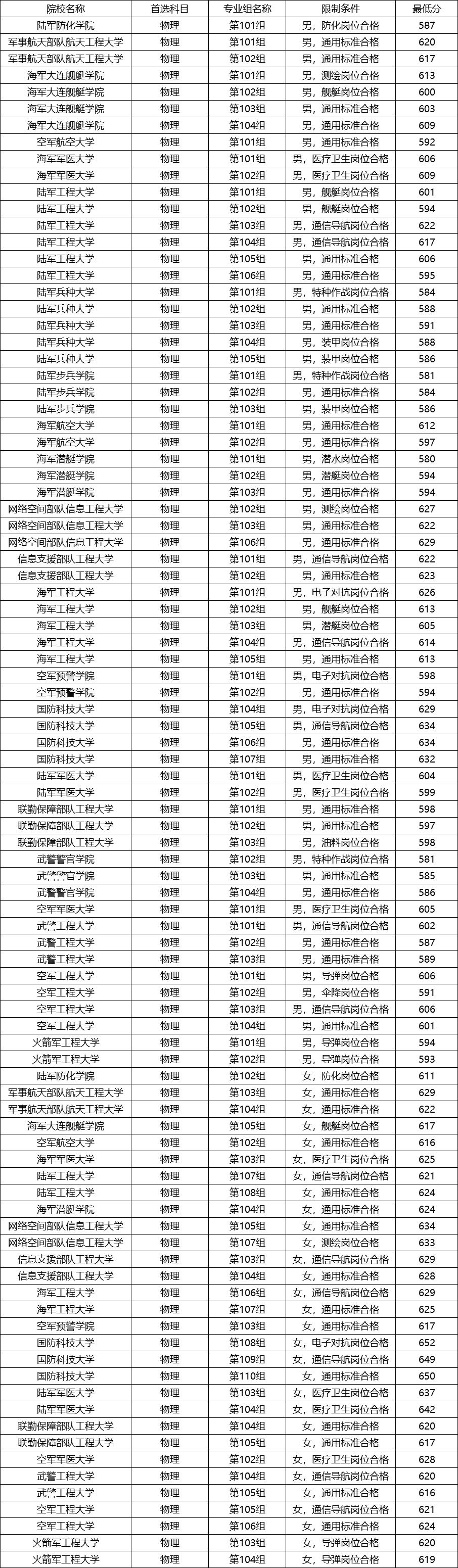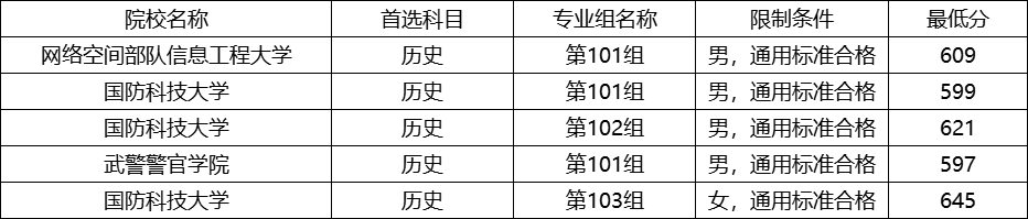 女性考生在历史类中仅有国防科技大学的第103组(通用标准合格)招生,最低分645分,这一分数远高于男性考生,凸显了女生在历史类军事院校中的稀缺性和高竞争度。