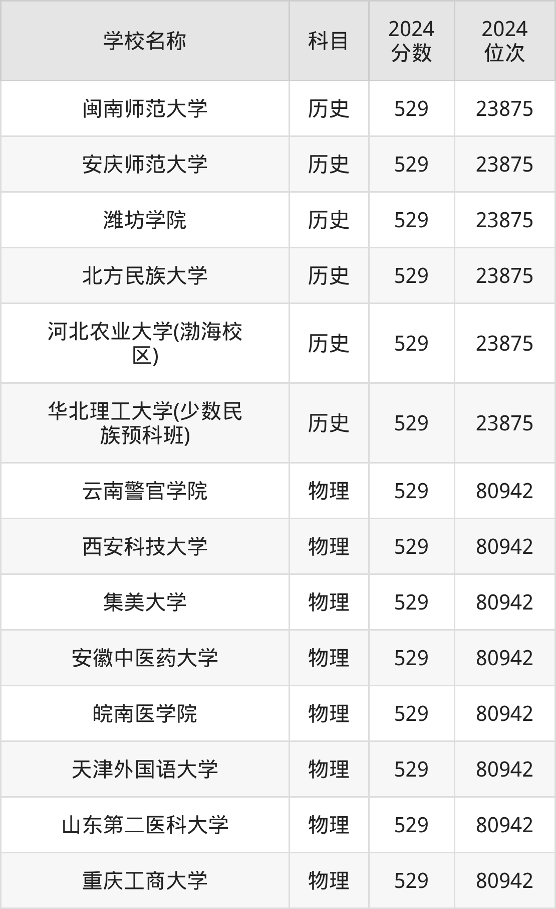 其中,物理组529分位于云南的学校有云南警官学院。历史组529分位于河北的学校有河北农业大学(渤海校区)。