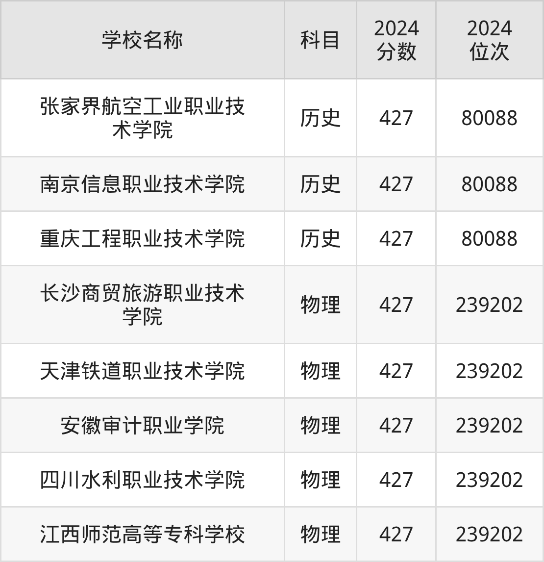 其中,物理组427分位于湖南的学校有长沙商贸旅游职业技术学院。历史组427分位于江苏的学校有南京信息职业技术学院。