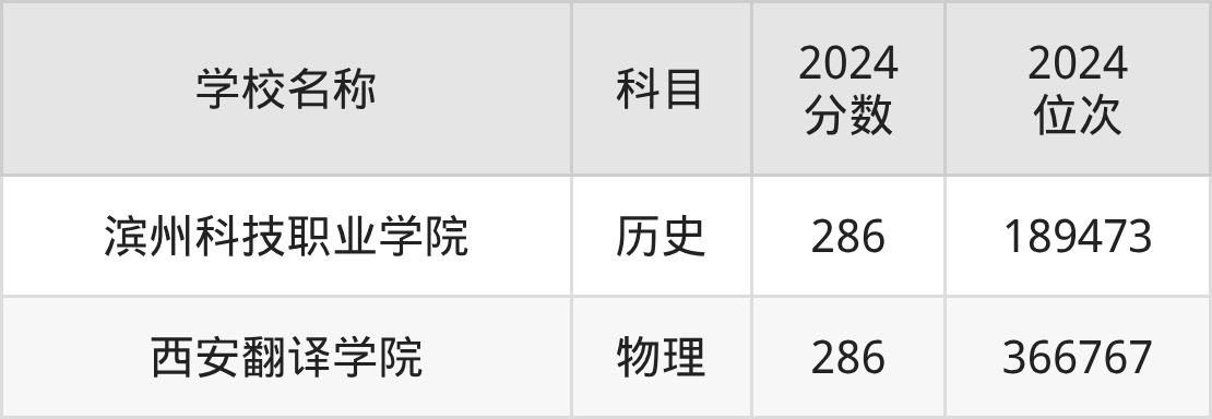 其中,物理组286分位于陕西的学校有西安翻译学院。历史组286分位于山东的学校有滨州科技职业学院。