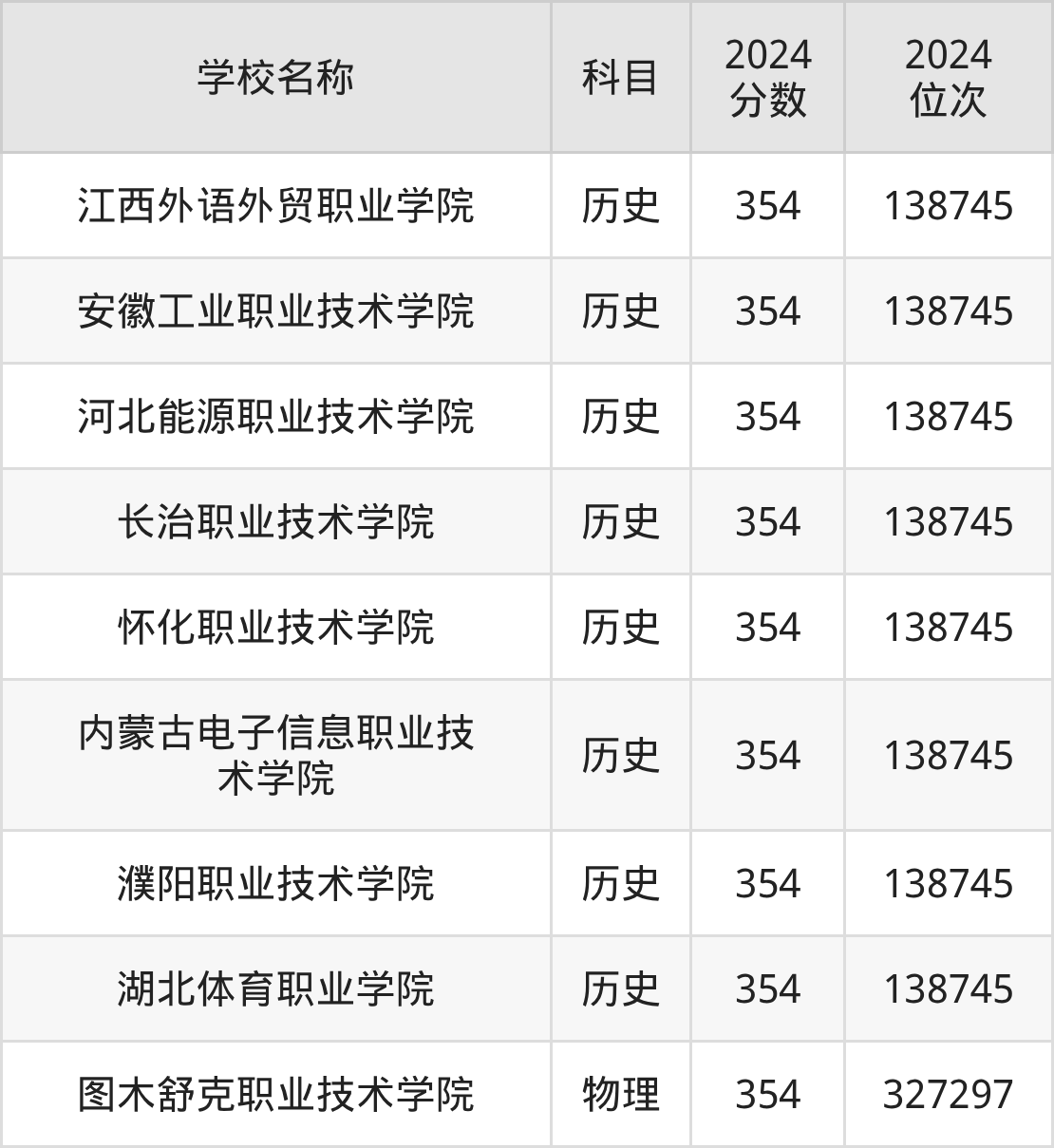 其中,物理组354分位于新疆的学校有图木舒克职业技术学院。历史组354分位于河北的学校有河北能源职业技术学院。