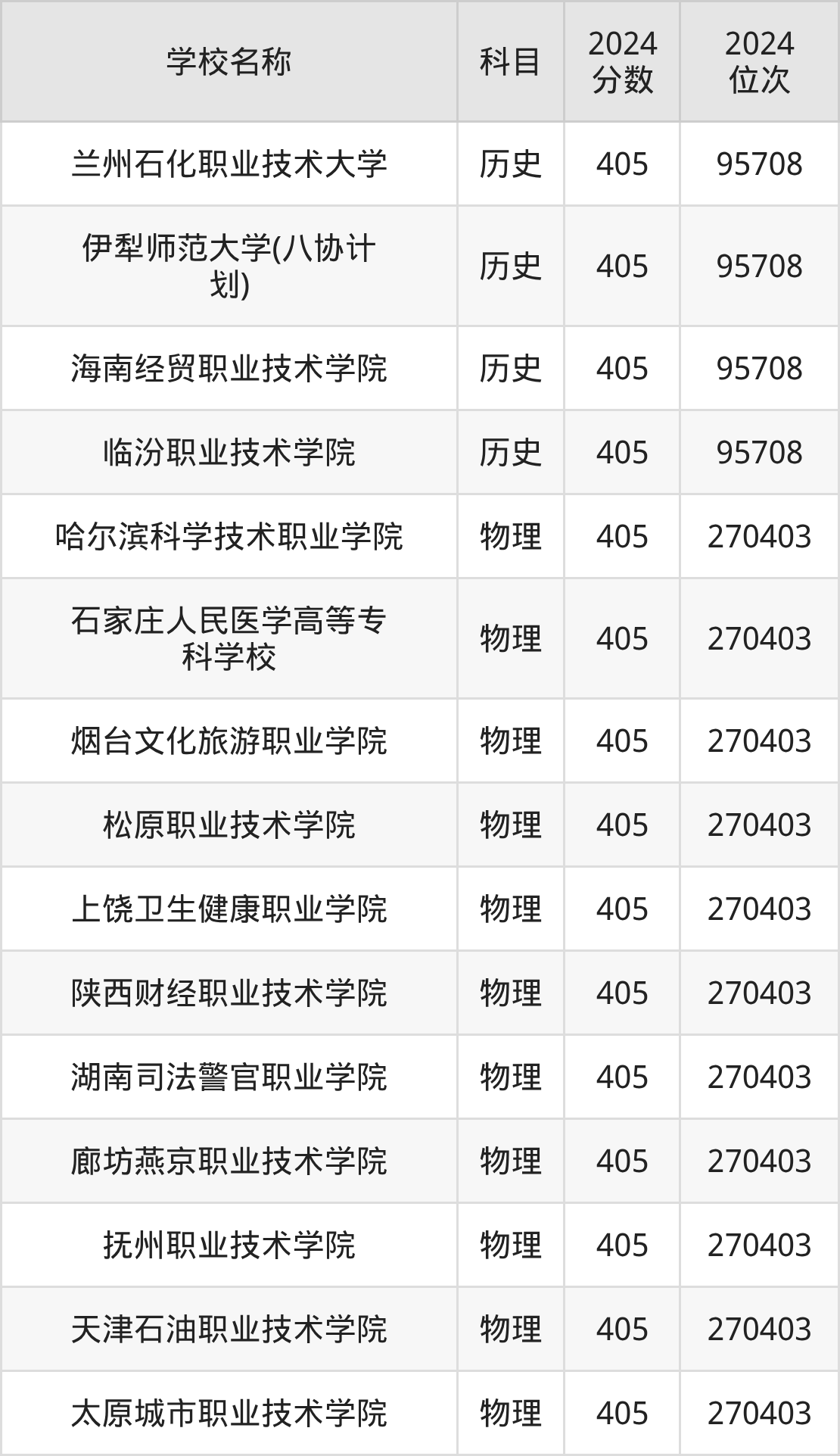 其中,物理组405分位于河北的学校有石家庄人民医学高等专科学校。历史组405分位于甘肃的学校有兰州石化职业技术大学。