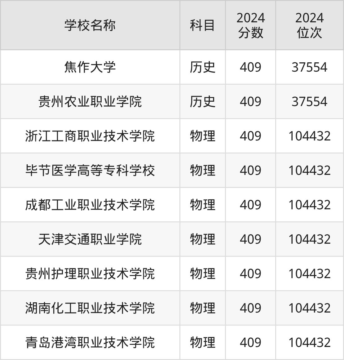 其中,物理组409分位于浙江的学校有浙江工商职业技术学院。历史组409分位于河南的学校有焦作大学。