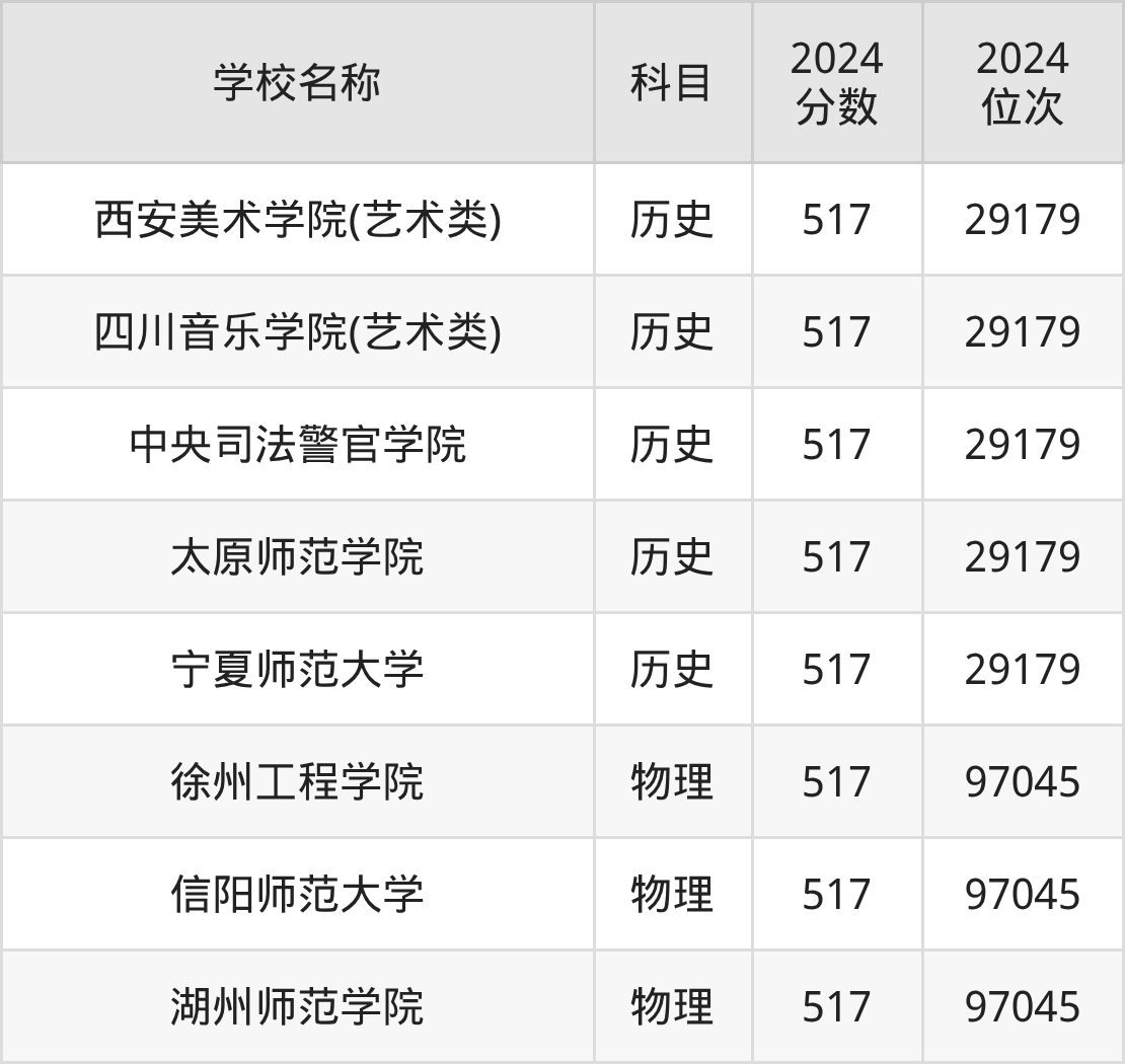 回看2024年河北高考最低分为517分的文科大学名单,物理组有3条数据,历史组有5条数据。