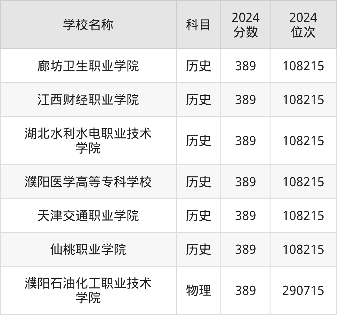 其中,物理组389分位于河南的学校有濮阳石油化工职业技术学院。历史组389分位于河北的学校有廊坊卫生职业学院。