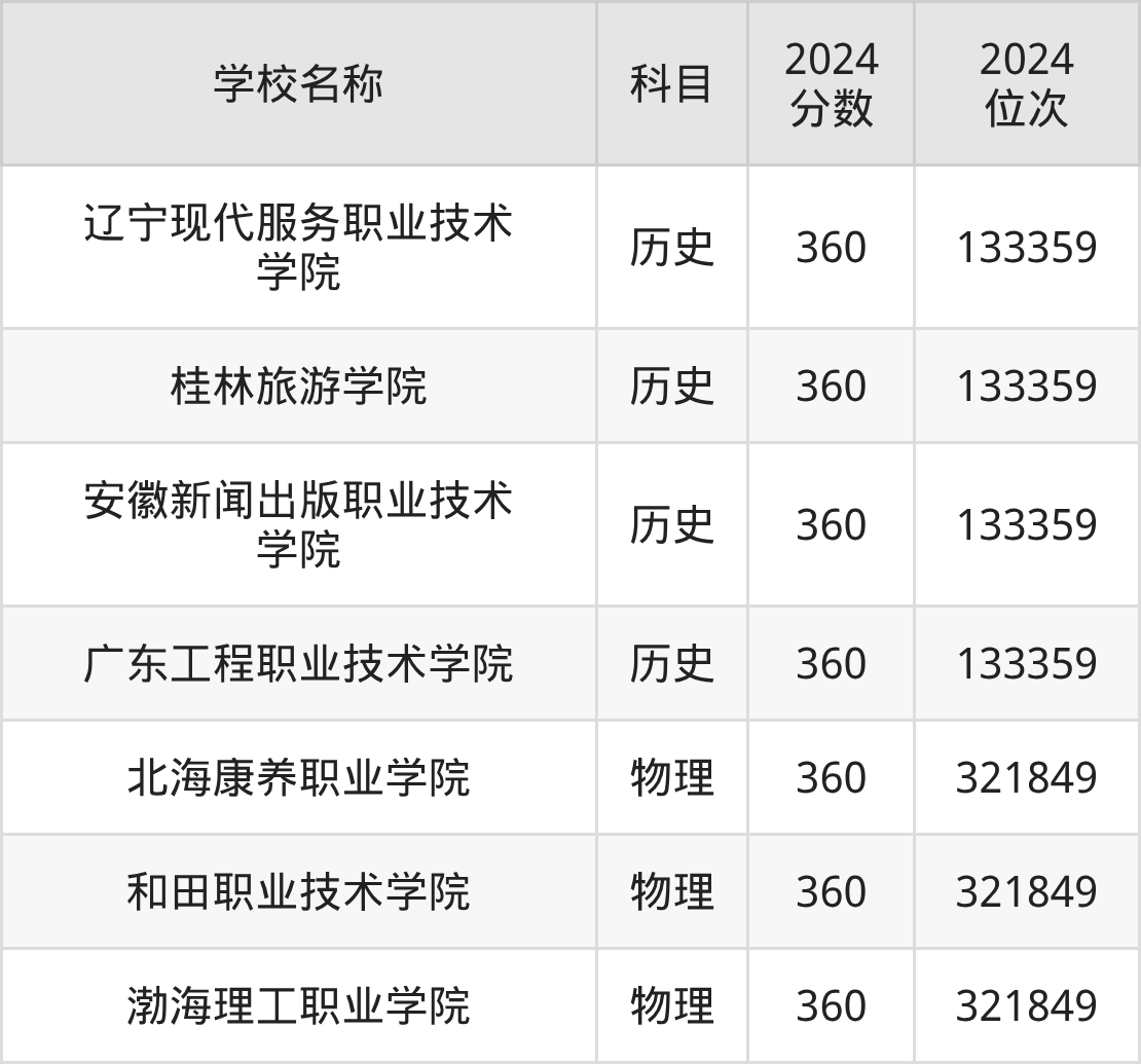 其中,物理组360分位于广东的学校有渤海理工职业学院。历史组360分位于广东的学校有广东工程职业技术学院。