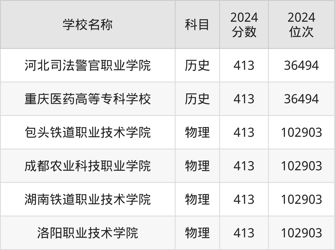其中,物理组413分位于内蒙古的学校有包头铁道职业技术学院。历史组413分位于重庆的学校有重庆医药高等专科学校。