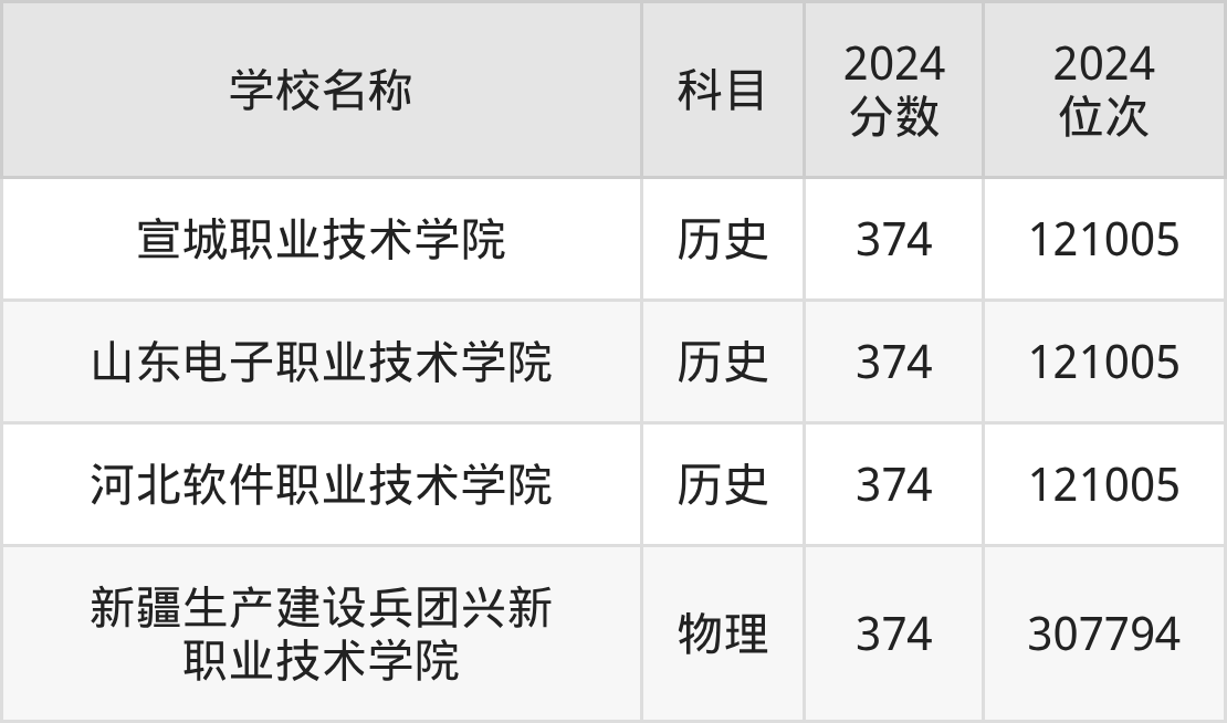 其中,物理组374分位于新疆的学校有新疆生产建设兵团兴新职业技术学院。历史组374分位于河北的学校有河北软件职业技术学院。