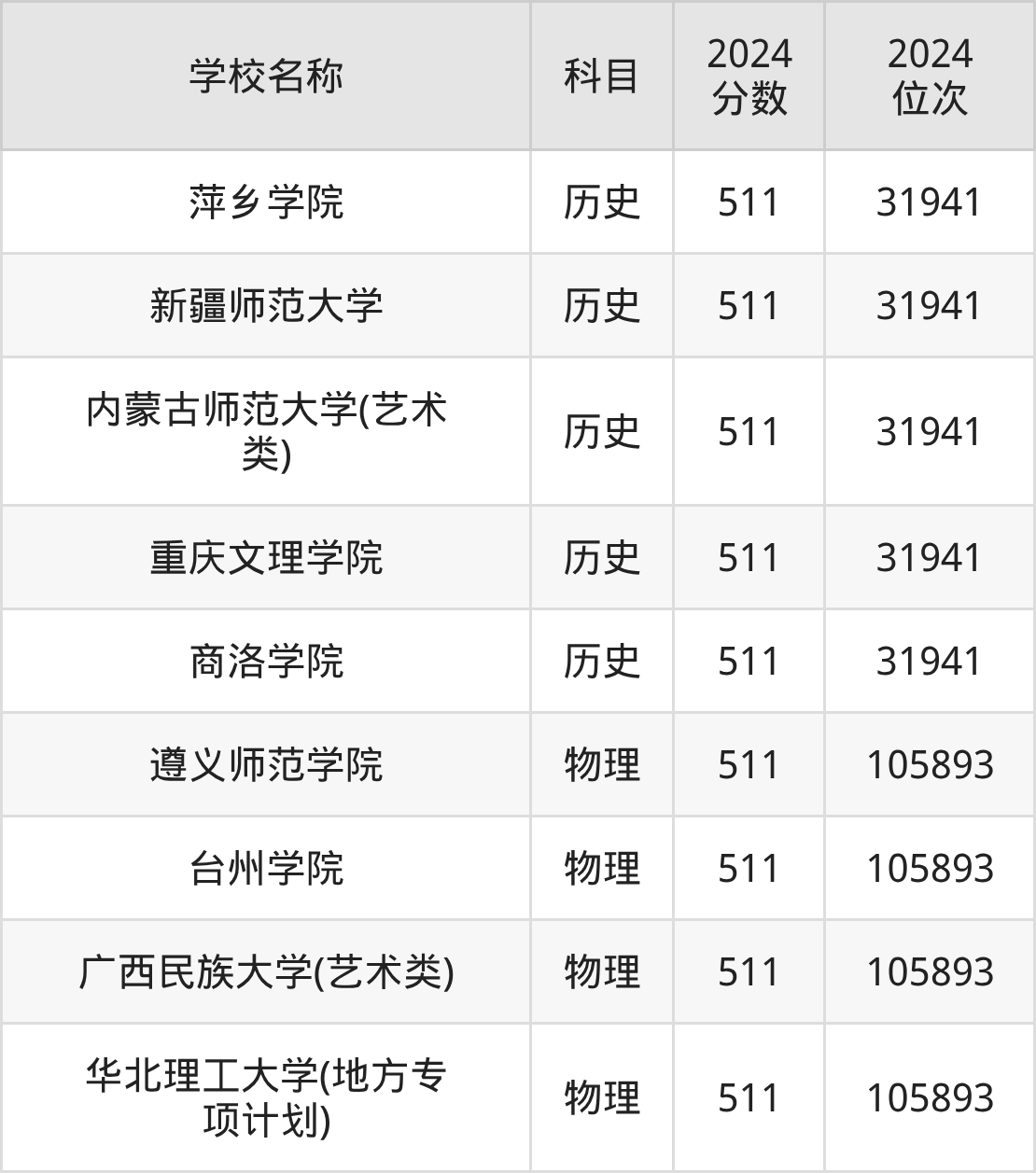 其中,物理组511分位于河北的学校有华北理工大学(地方专项计划)。历史组511分位于江西的学校有萍乡学院。