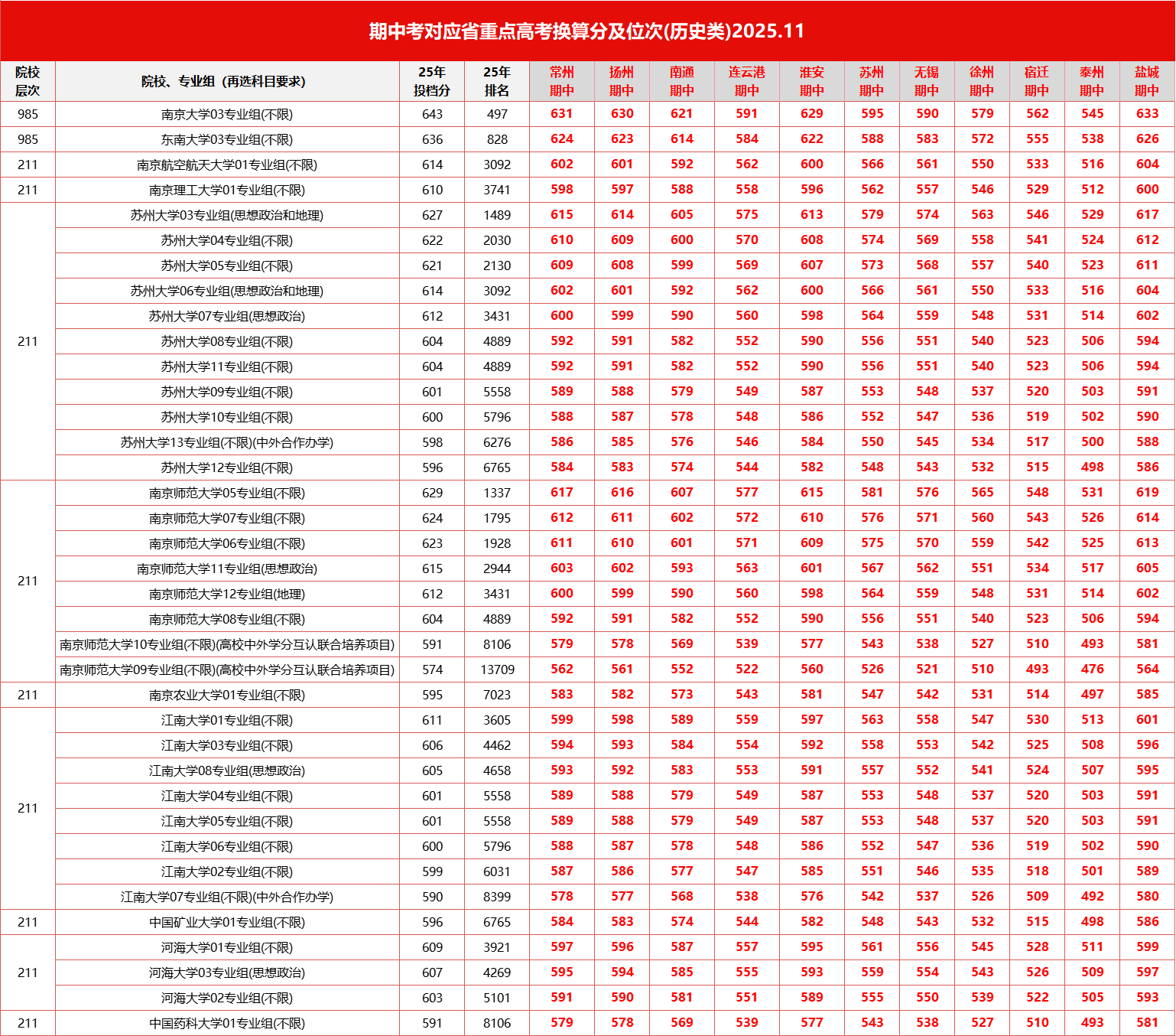 (1)南京大学03专业组(不限科目),2025年投档分643分,省排名497。在期中考中,常州市需631分、扬州市需630分、南通市需621分才能等效达到该水平。这意味着,历史类考生若在常州模考中获631分以上,有望冲刺南京大学;分数低于630分,则需提升排名。